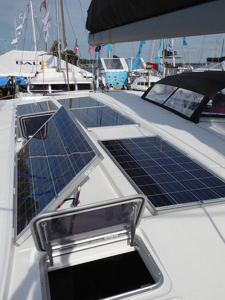 Picture 2 – Up on the coachroof you’ll find this massive 900-watt solar array (comes standard, of course) with the hard glass panels neatly installed in recessed mounts. They also can be canted toward the sun when necessary