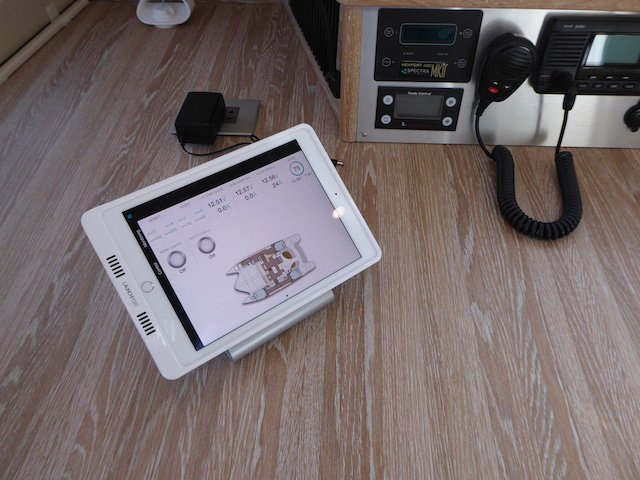 Picture 6 – The boat also comes standard with this cool iPad brain. It controls and monitors most systems and also the distributed power network, which Nigel Calder in my presence described as the best such installation he’d ever seen. The iPad also gathers maintenance and operating data for all onboard systems and shares this with the builder every time it is connected to the Internet