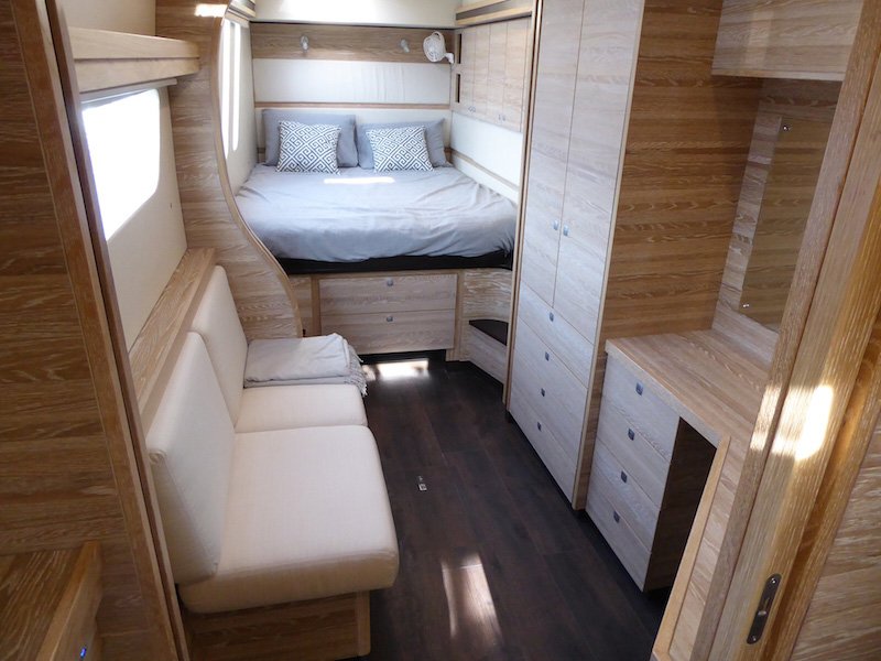 Picture 5 – Finish quality is to a reasonably high standard, as you can see here in the master stateroom (it took up the whole starboard hull in the boat at the show and includes a large dressing area and a huge head and shower). Those portlights that seem a bit goofy on the outside seem fabulous on the inside, as they let in scads of light. And though this looks like heavy furniture, it actually isn’t, as everything is foam-cored to reduce weight
