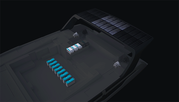 sailing catamaran with its parallel hybrid drivetrain, 60 kWh li-battery bank, and 4.75 kWp of solar panels.