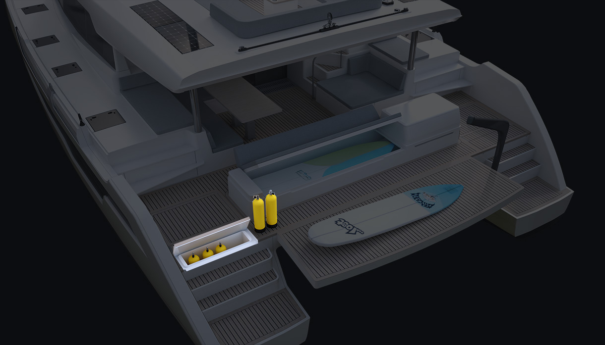 A detailed look at the stern, including the hydraulic tender platform and the unique water toy garage