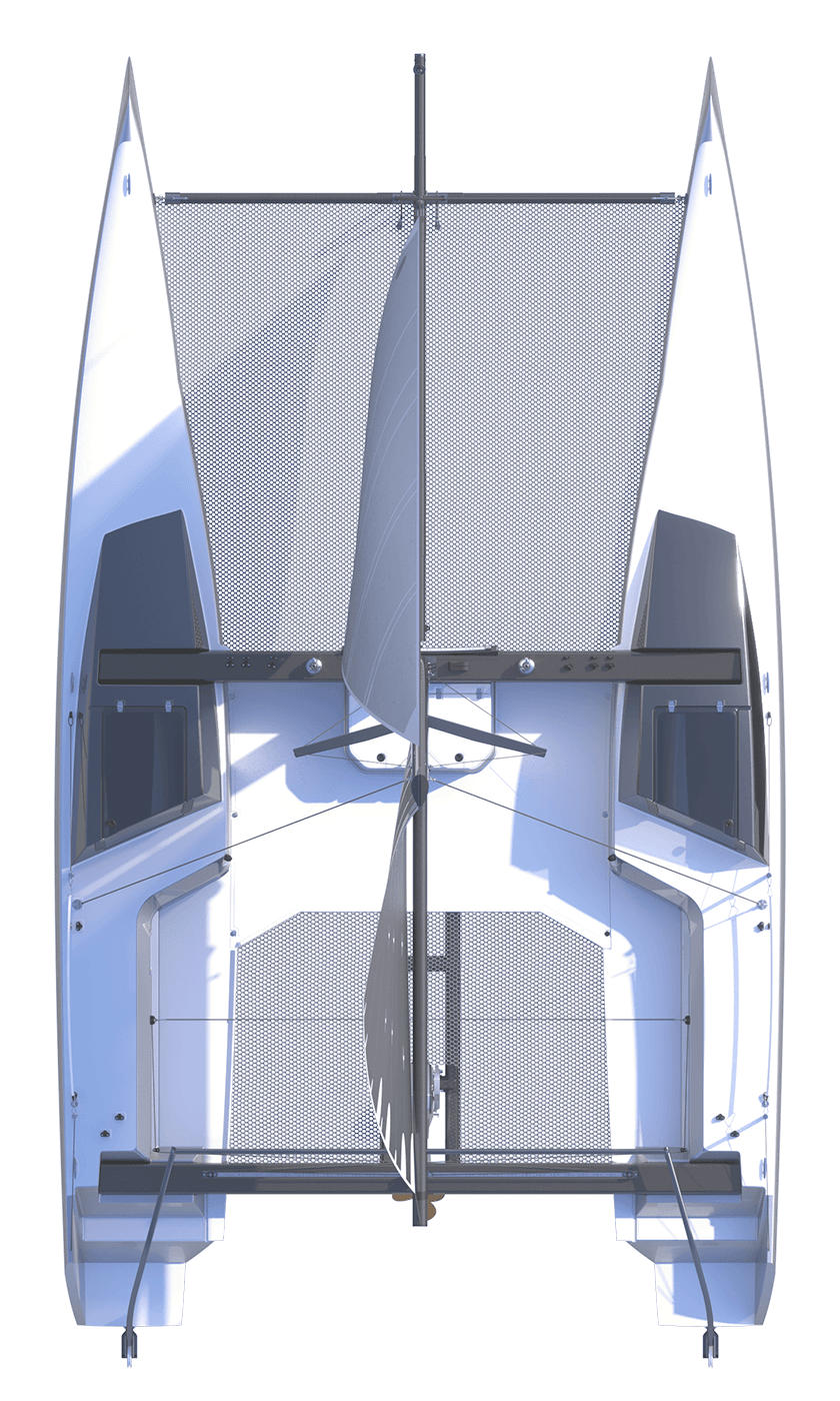 The Sportcat’s minimal displacement is achieved through an infusion process using e-glass, vinylester, and carbon reinforcement. This construction, along with the use of netting rather than heavy decking, ensures that the boat remains light without sacrificing strength or durability.