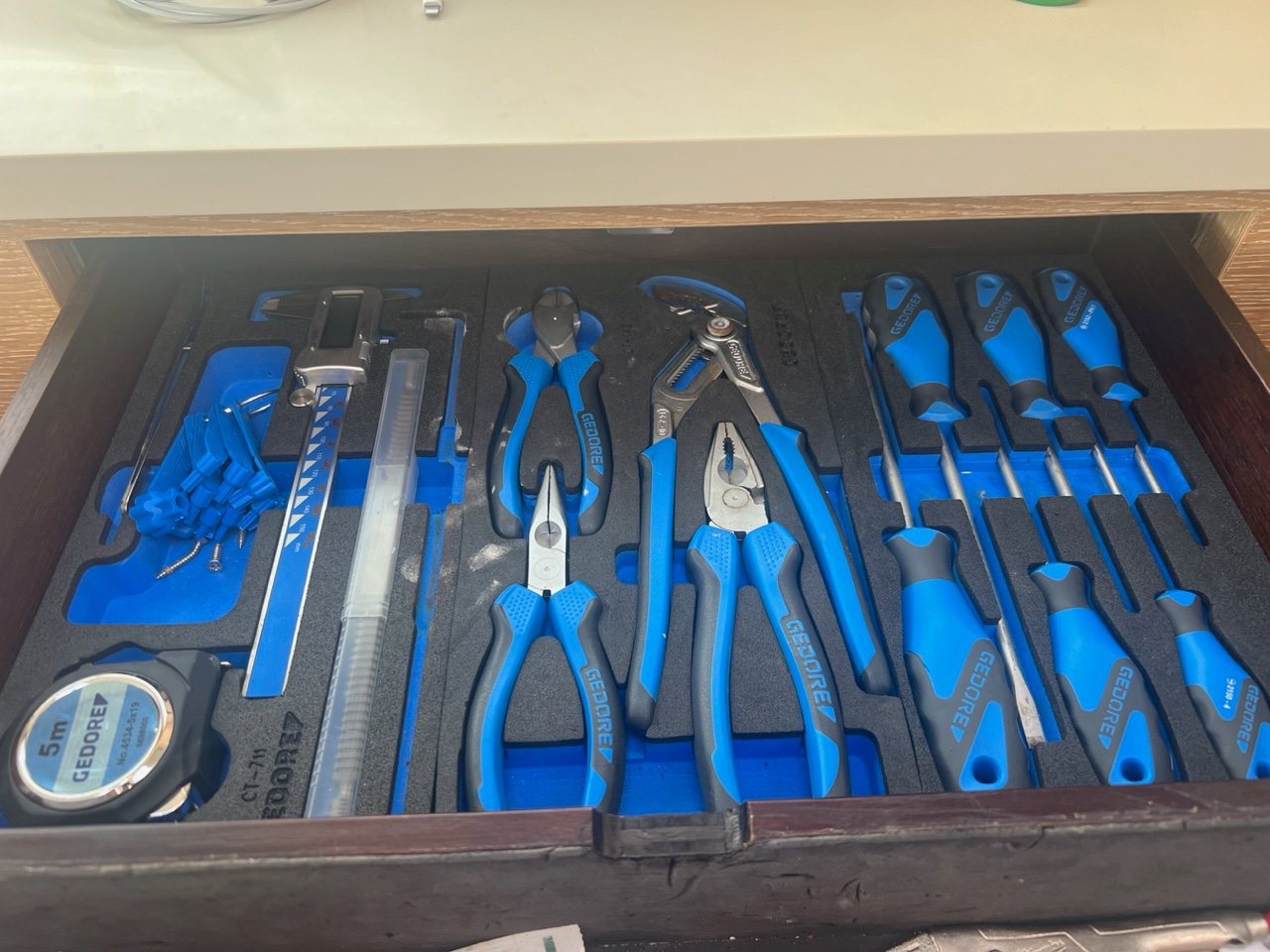 Washer drier mounted in dedicated cupboard with removable shelves above