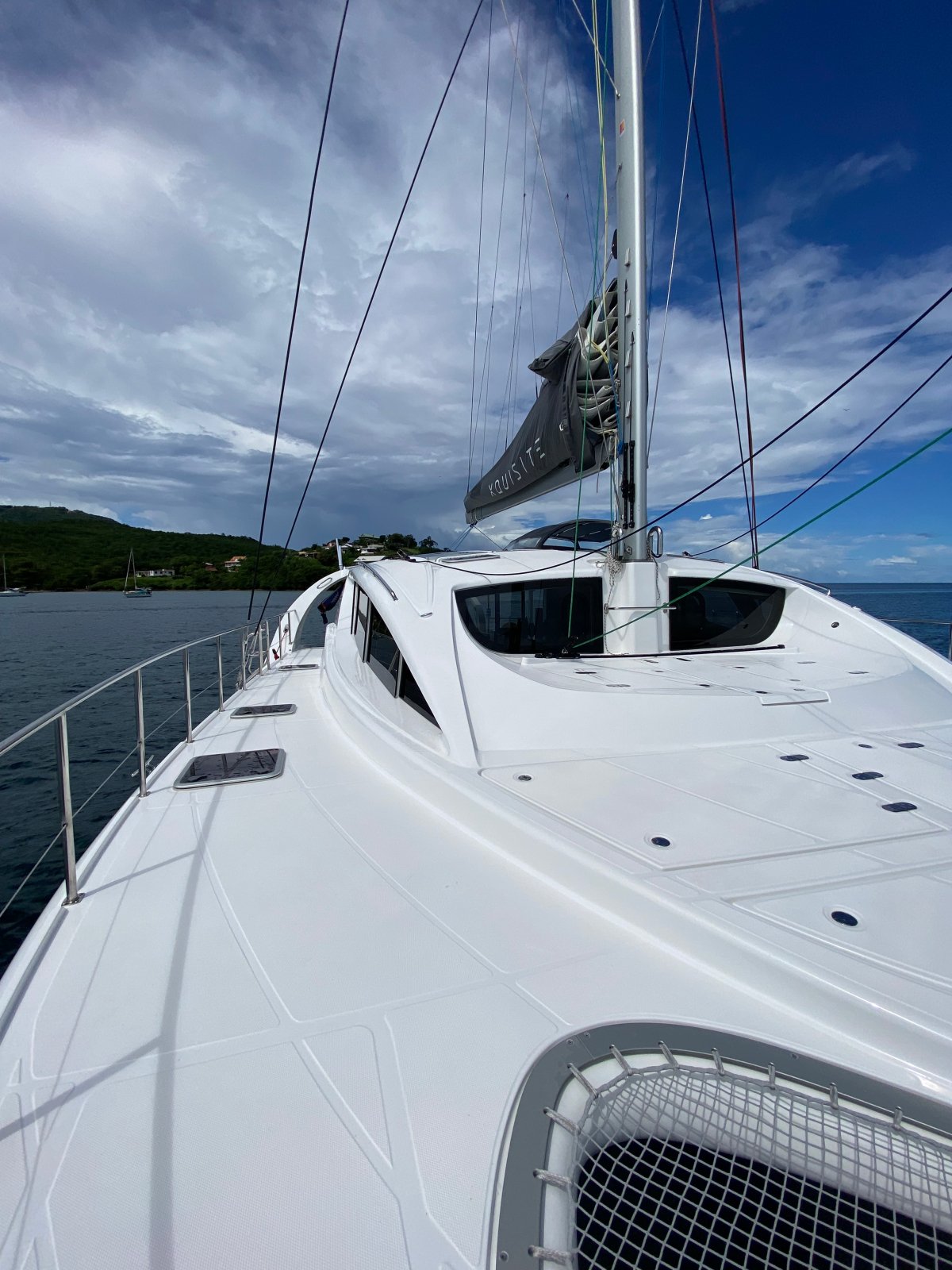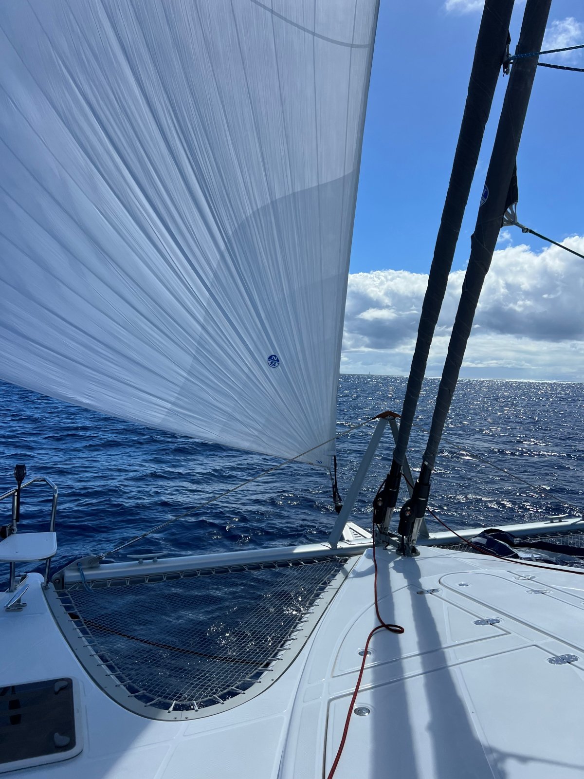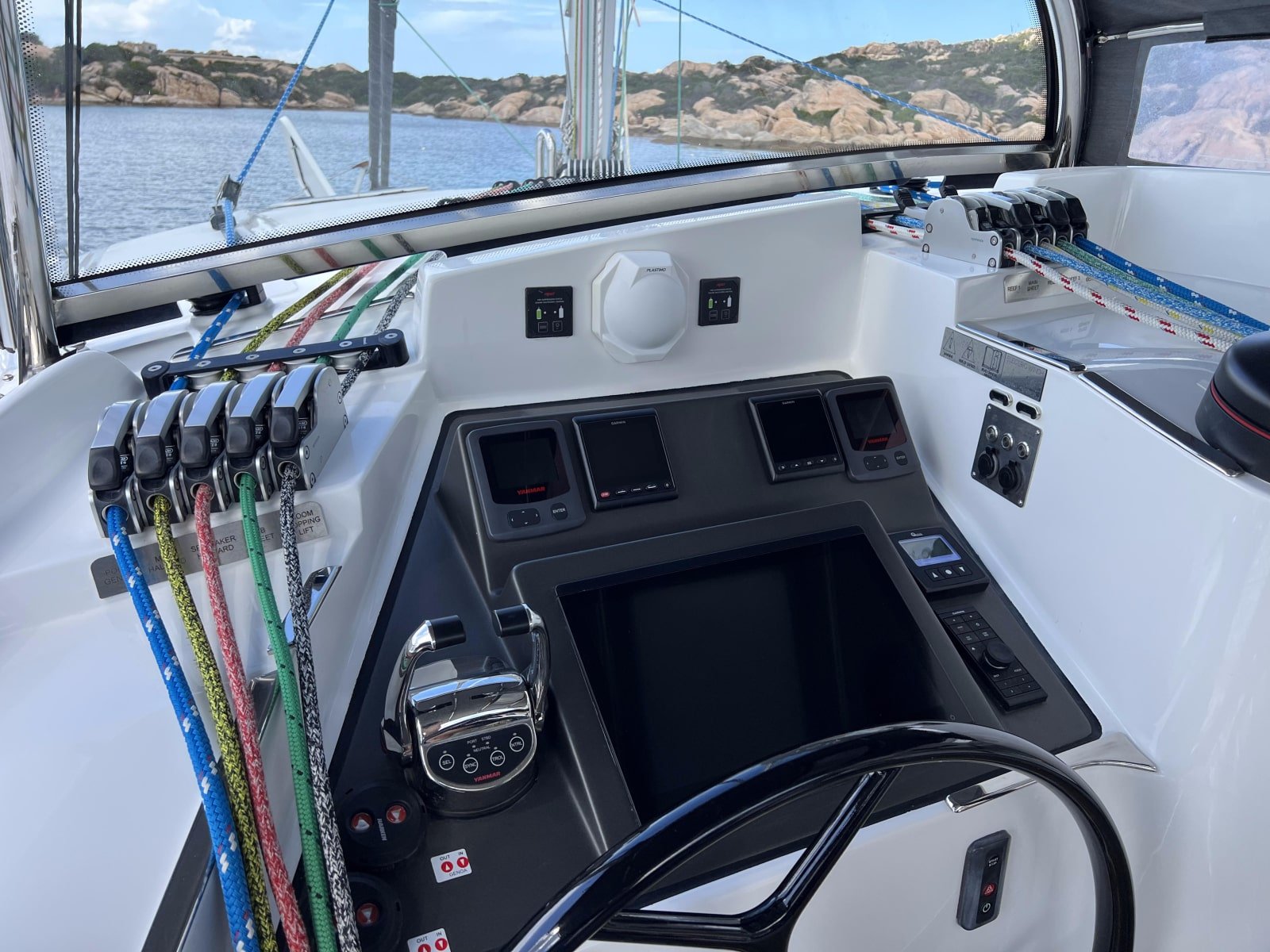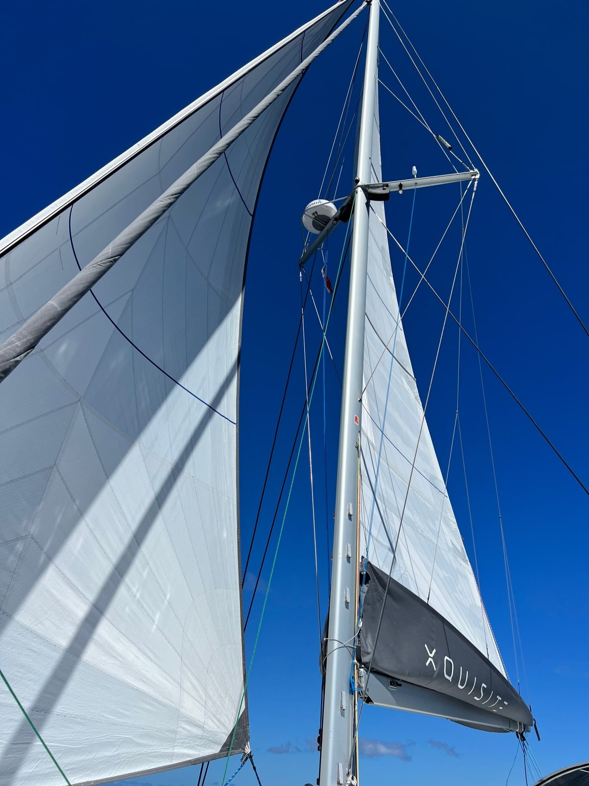 | Electric Roller furling self tacking Jib with curved traveller situated in front of mast step with jib sheet led aft to winch in cockpit | |