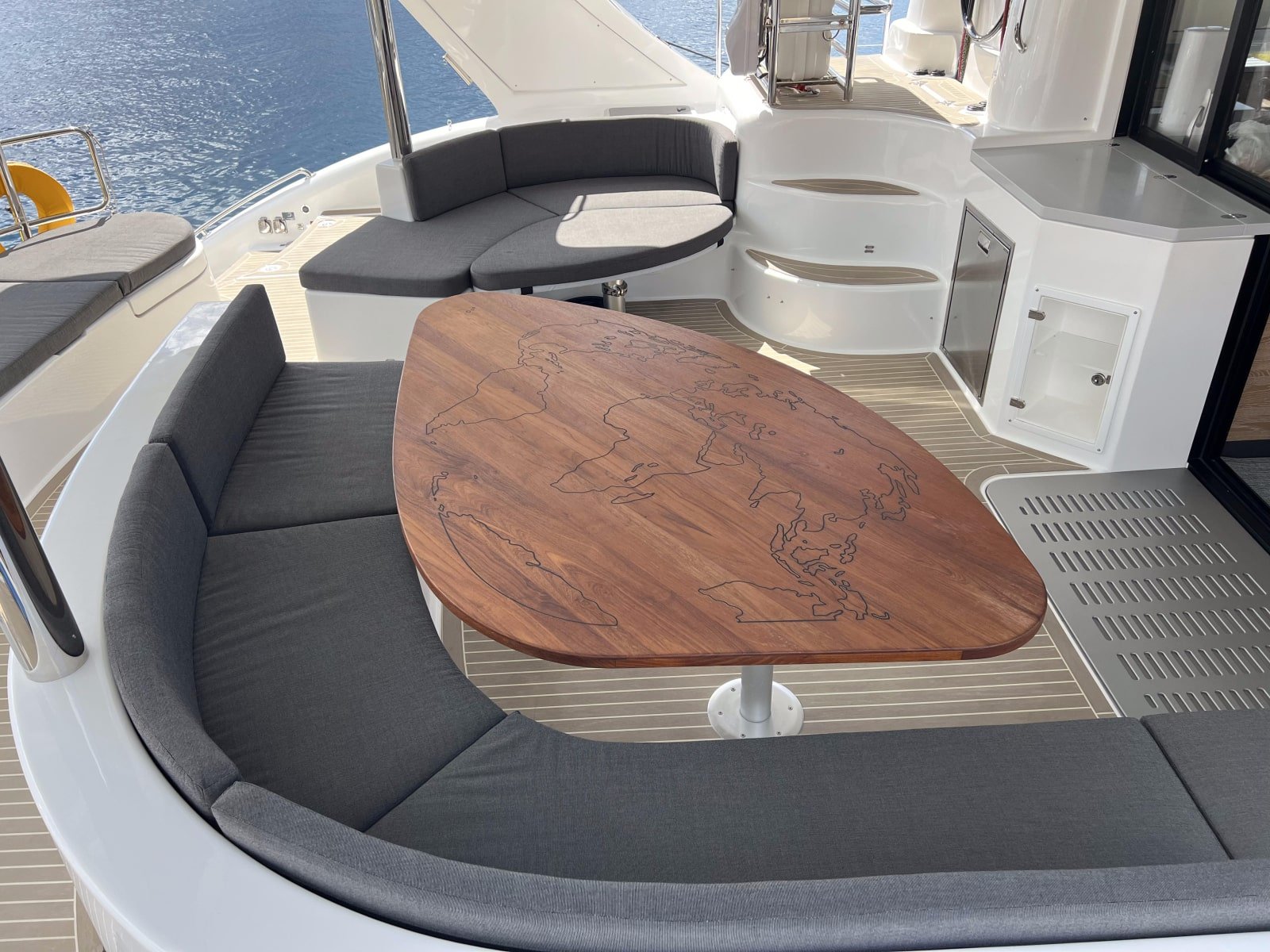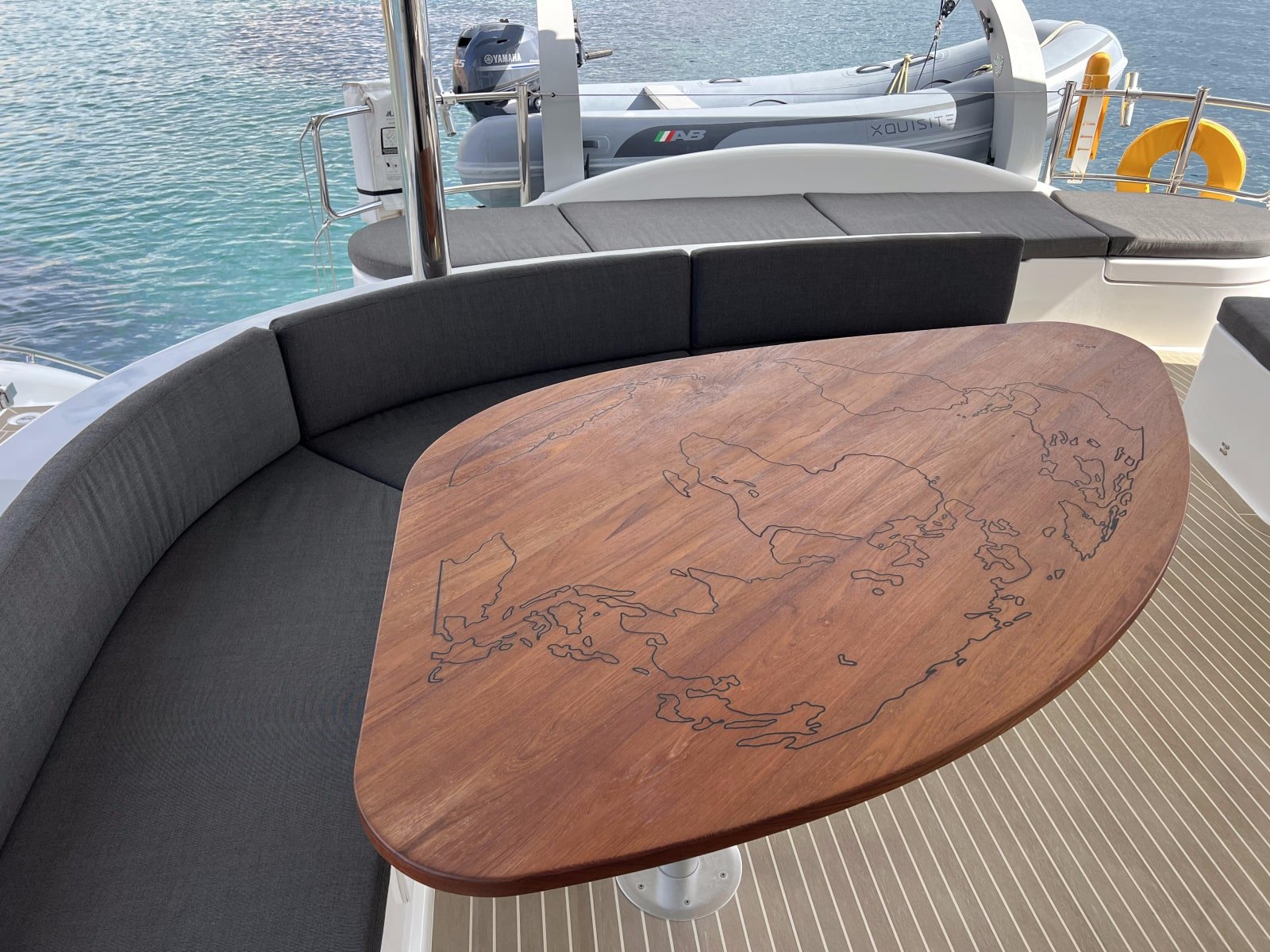| Large teak cockpit table incorporating world map in black polyurethane on fixed aluminum legs | |