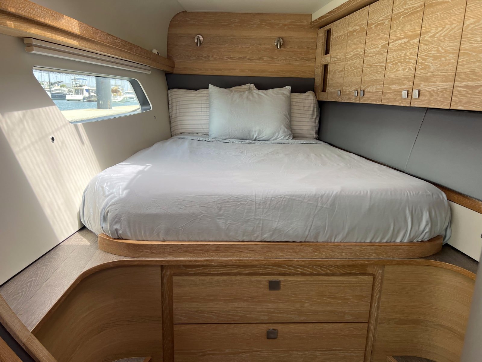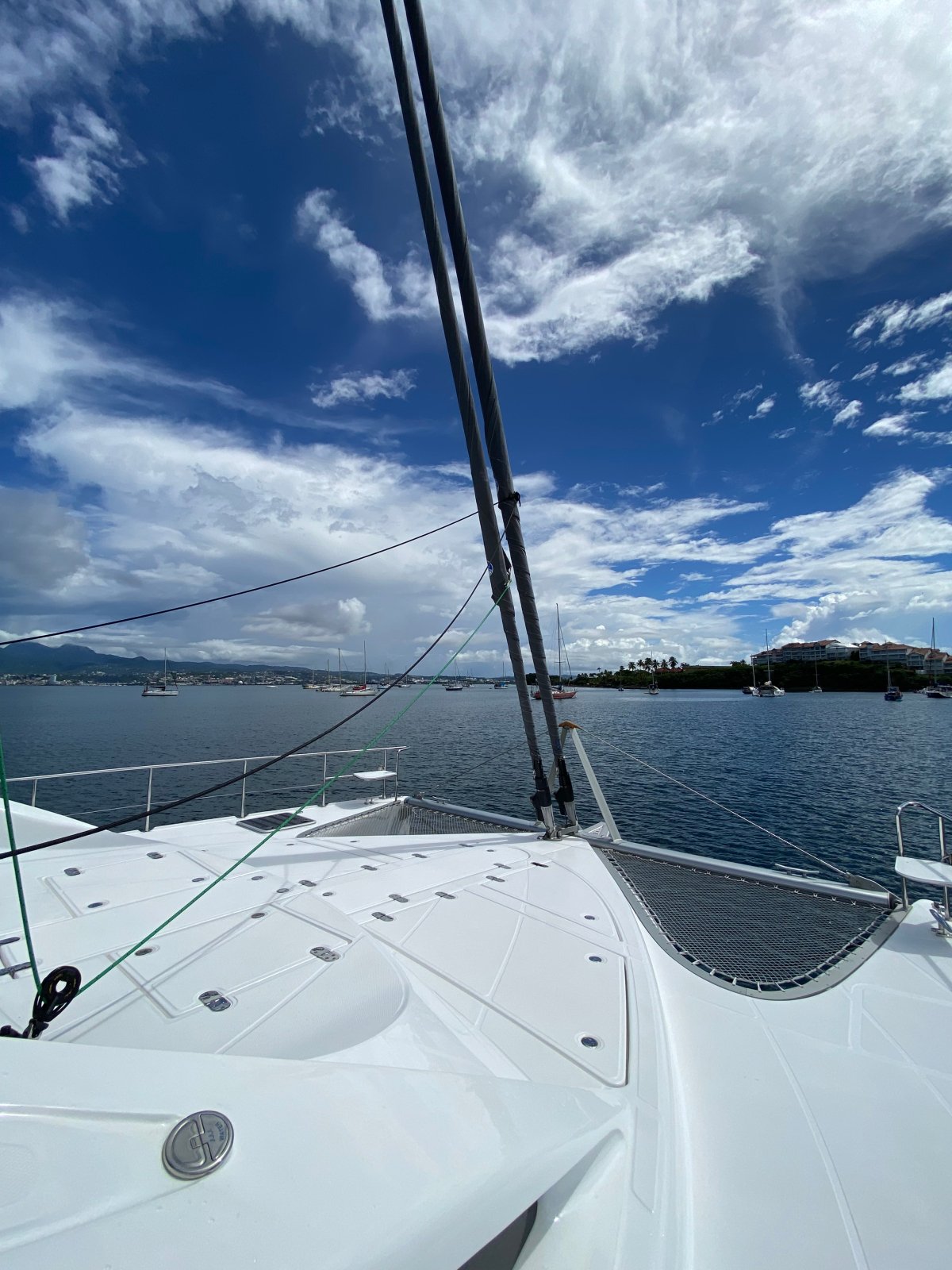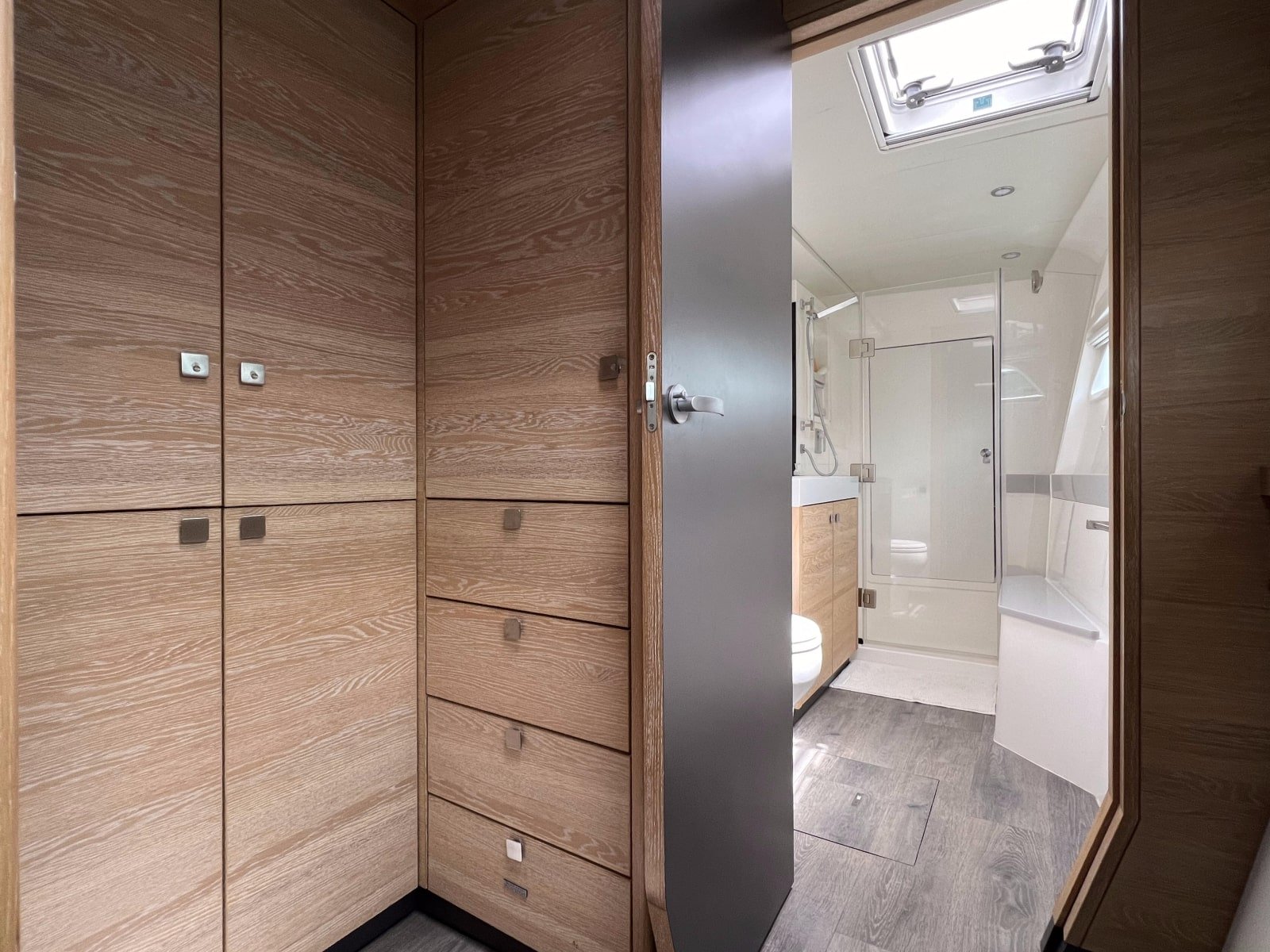 | Large access opening deck hatch on port foredeck peak gives access to white flow coated locker with ladder going down into locker | |