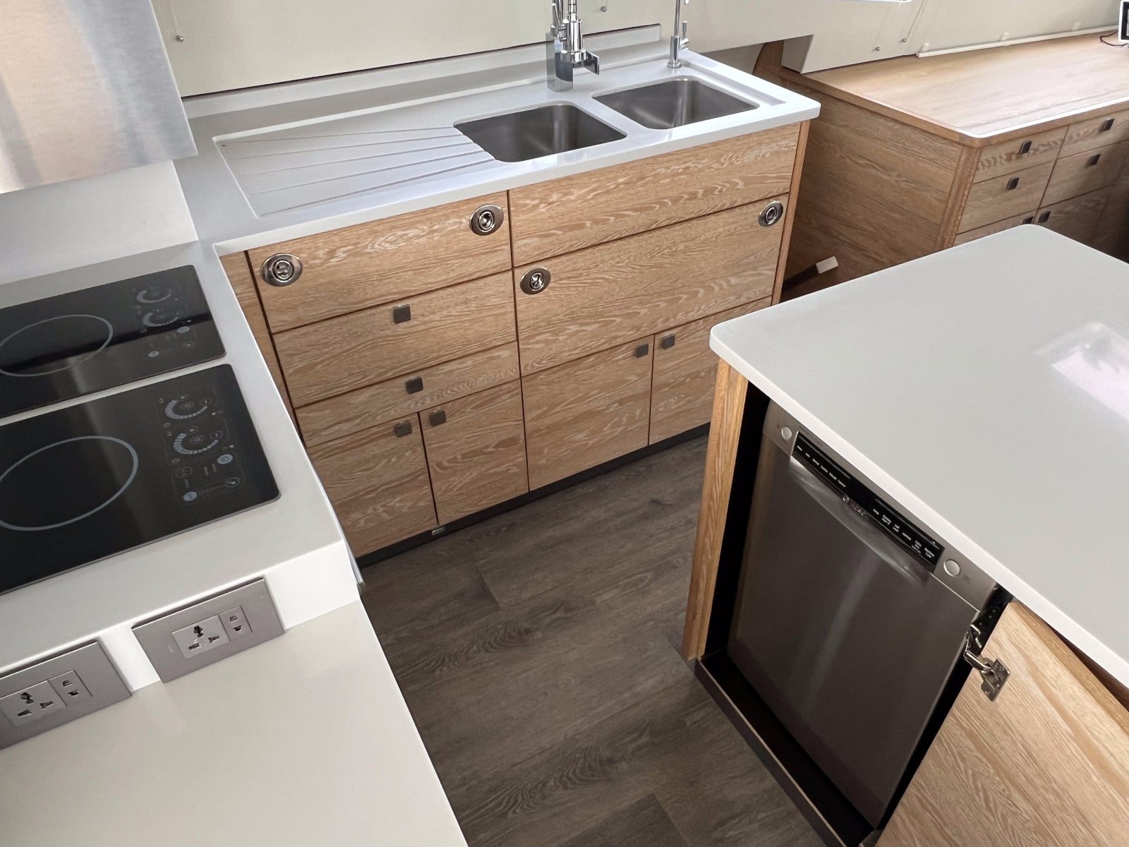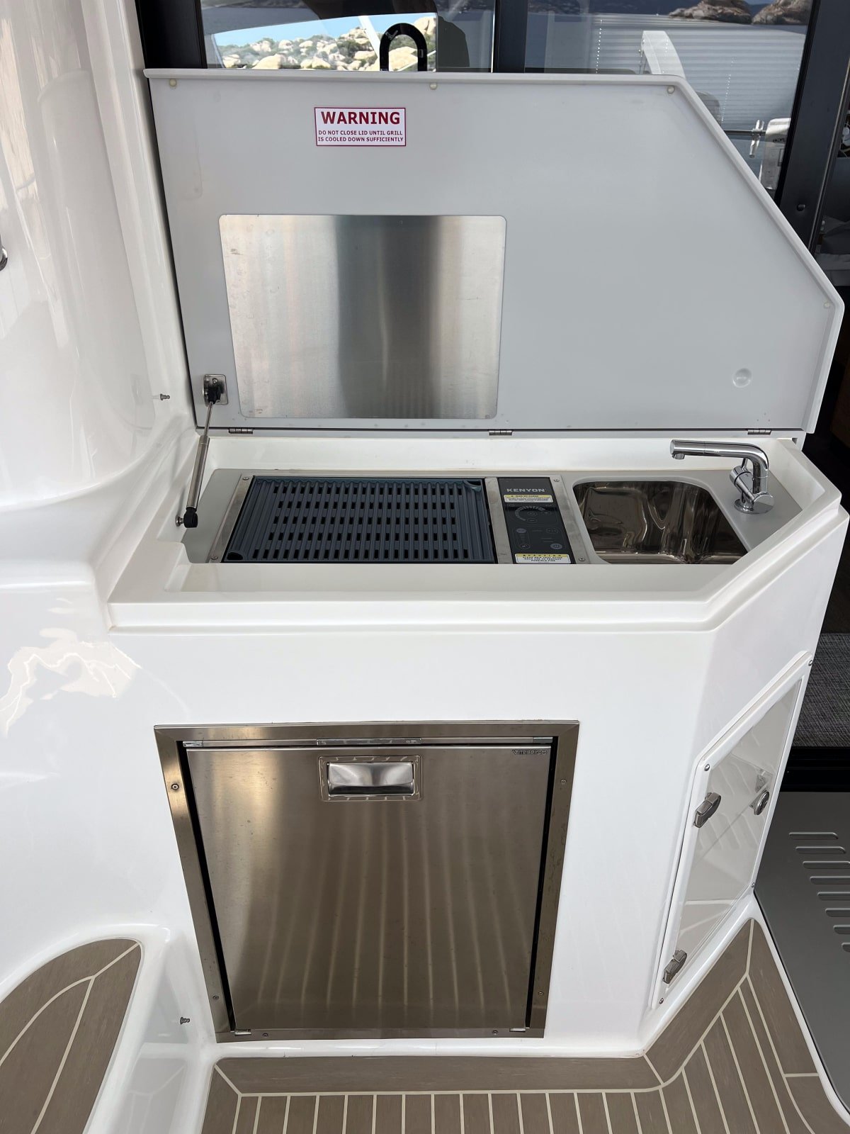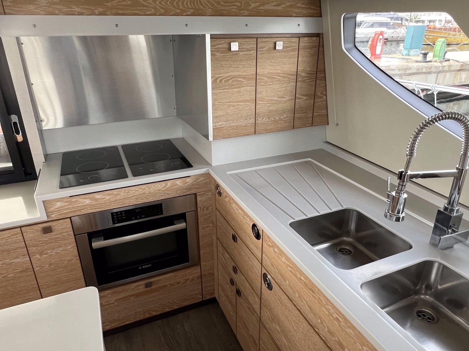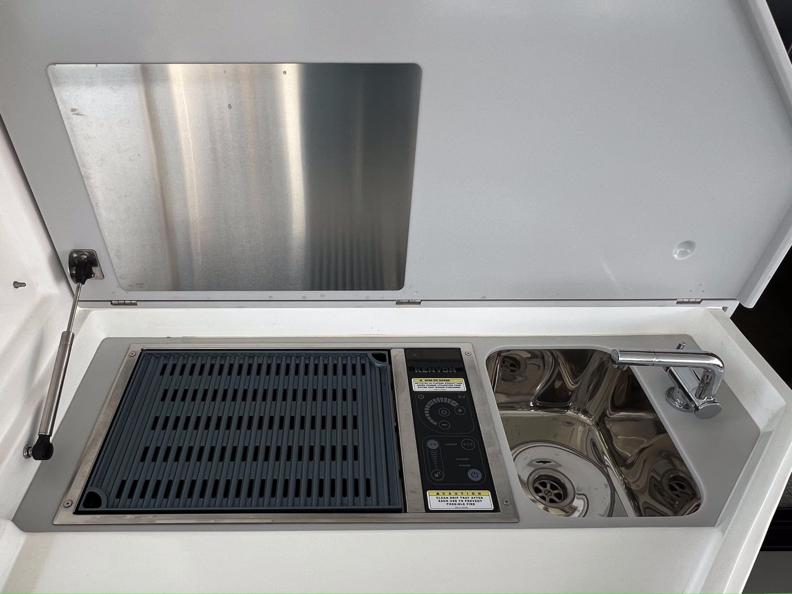 | Wet bar in cockpit incorporating solid surfacing counter top with under mounted GRP sink and mixer tap | |