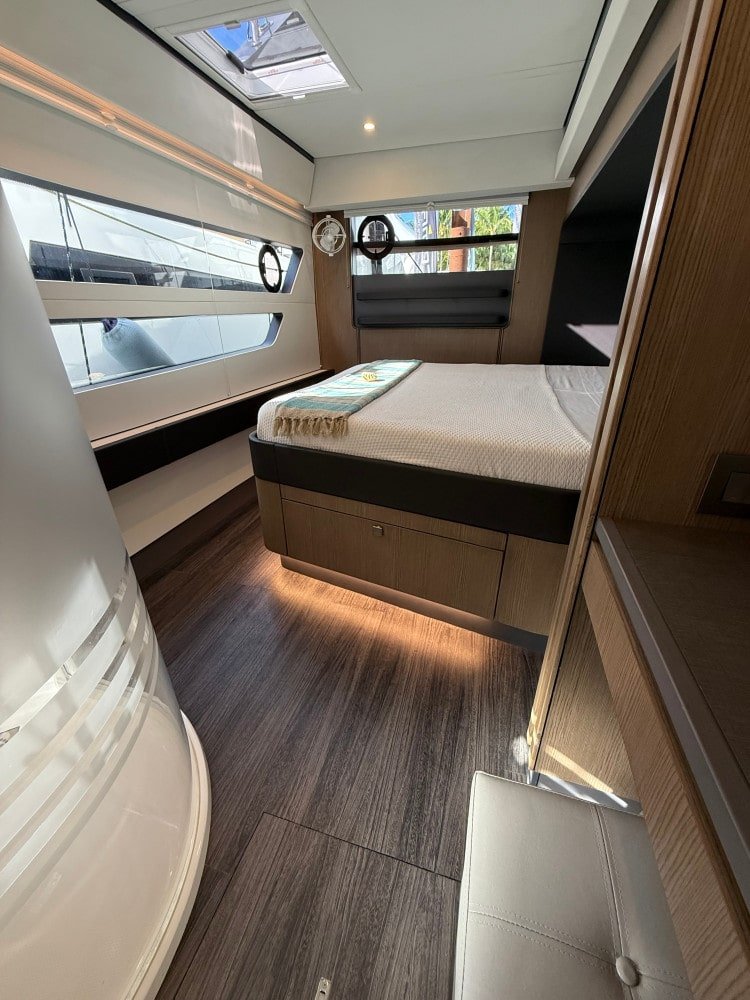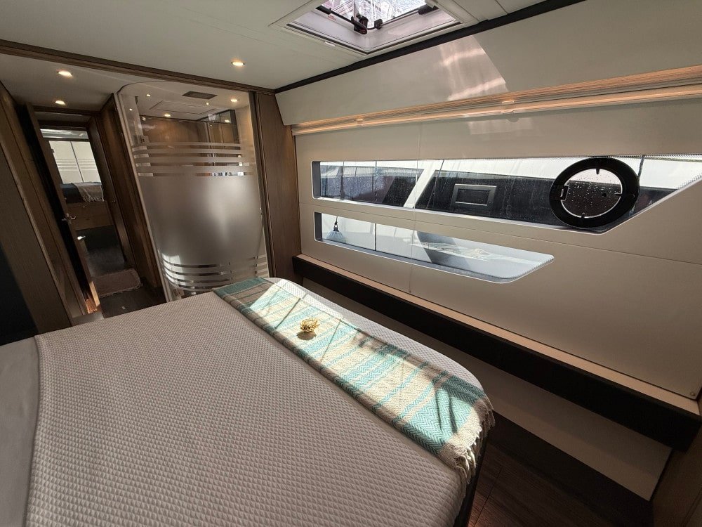 - Spacious, smart layout:Her spacious king-sized cabins, expansive galley, large flybridge with retractable awning, high-end finishes, and panoramic views ensure comfort without sacrificing eco-friendliness.
