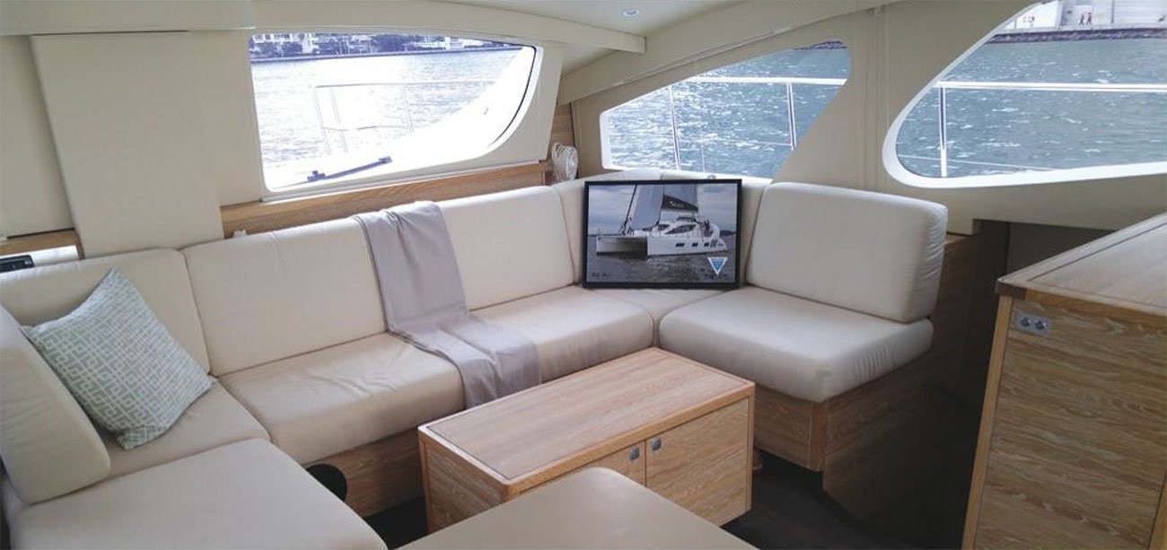 Enter the cabin through a recessed sliding door. The grating in the cockpit floor at the door and a protective cowling under the bridgedeck prevent water from getting inside. You are immediately taken with the panoramic views from the main saloon. Also standard are pleated blinds for the entire saloon and the hull cabin windows for privacy. The headliner houses the recessed LED lighting throughout the vessel operated by light switches conveniently located. The U-shaped settee is to starboard with cloth upholstery and wraps around a fixed saloon table with storage compartments under both the seating and table. Three large opening deck hatches and a sliding window to the cockpit provide excellent ventilation.