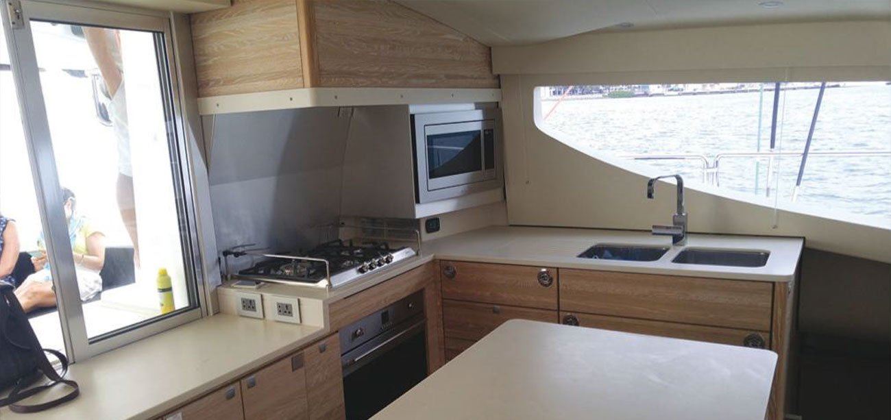 The hulls and deck are a composite sandwich made up of E Glass and Multiaxial glass with Divinycell com- posite foam infused with epoxy. The bulkhead thickness is 24 mm and there are dedicated collision bulkheads at the bow and transom to protect the engines and the bottom section of each keel. High-density materials are used along with stainless steel backing plates under all the deck fittings.
