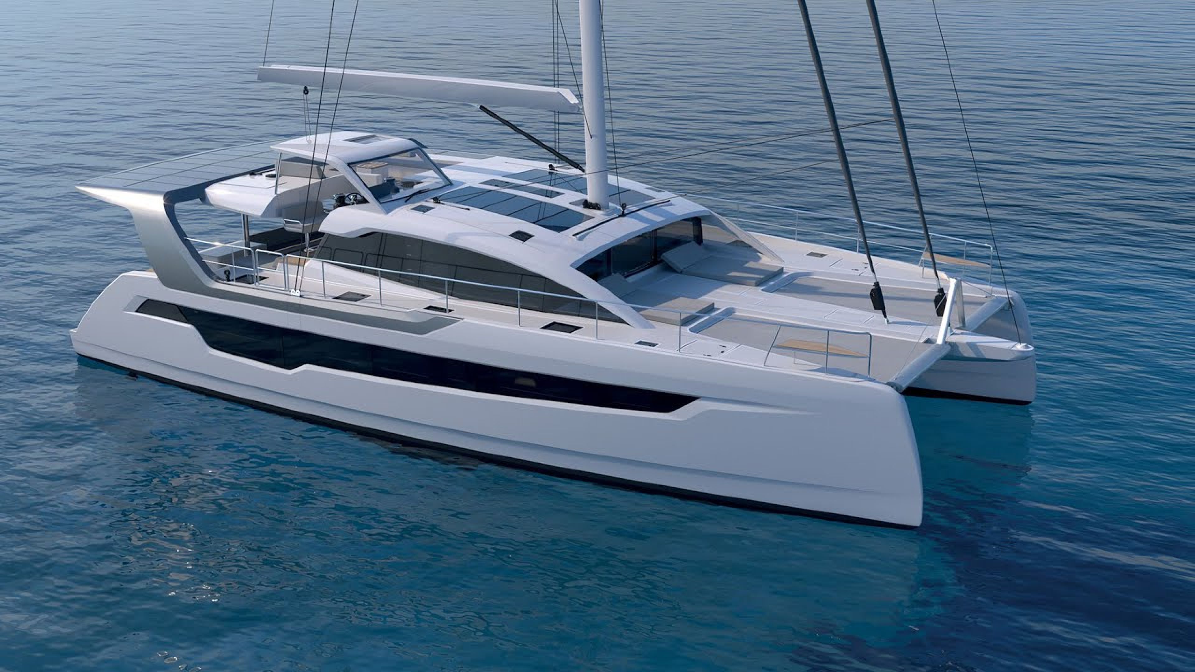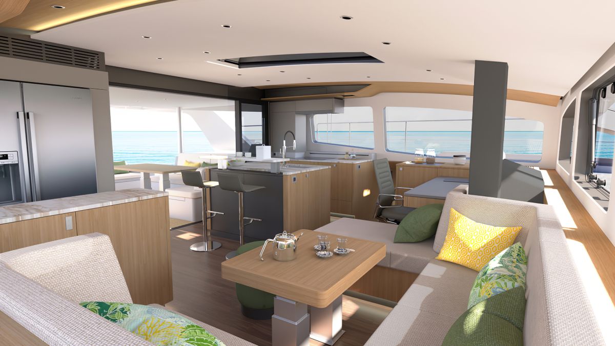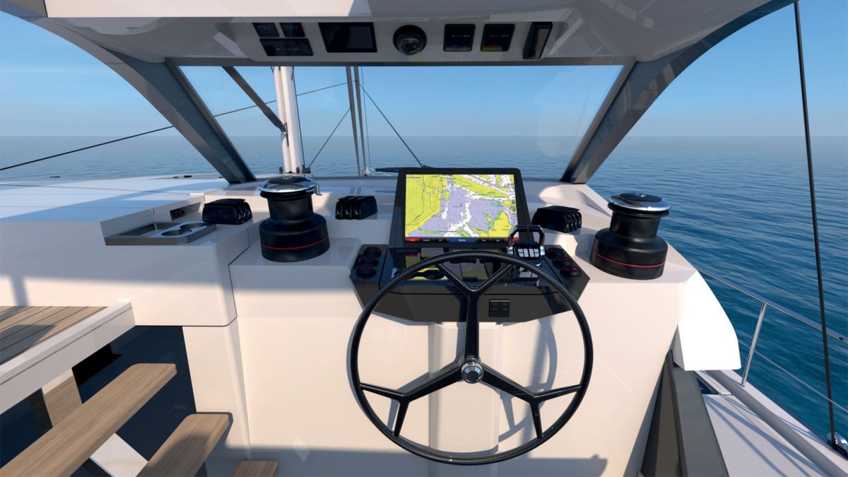 With features like all-electric sail controls from the protected helm station, this yacht is engineered for sailors who value ease and efficiency. The cat also includes a carbon fiber boom furling mainsail and electric traveler, making single-handed sailing a breeze.