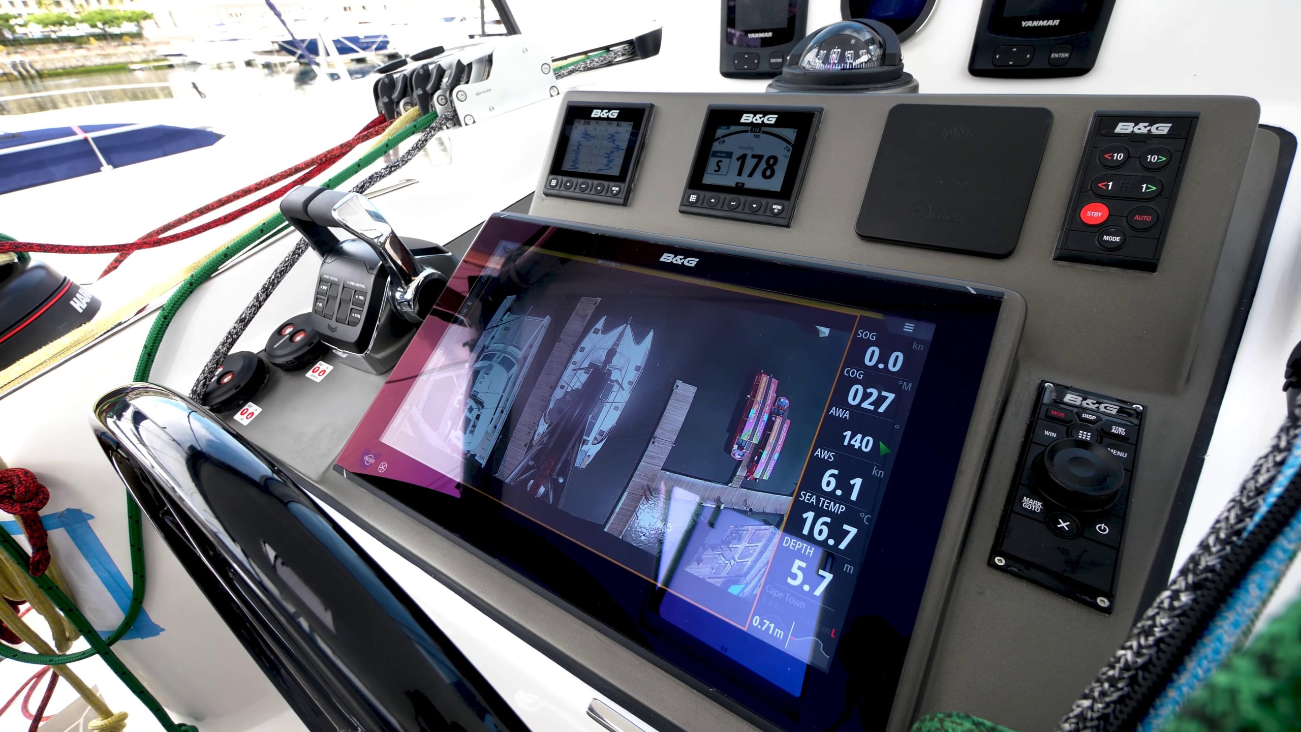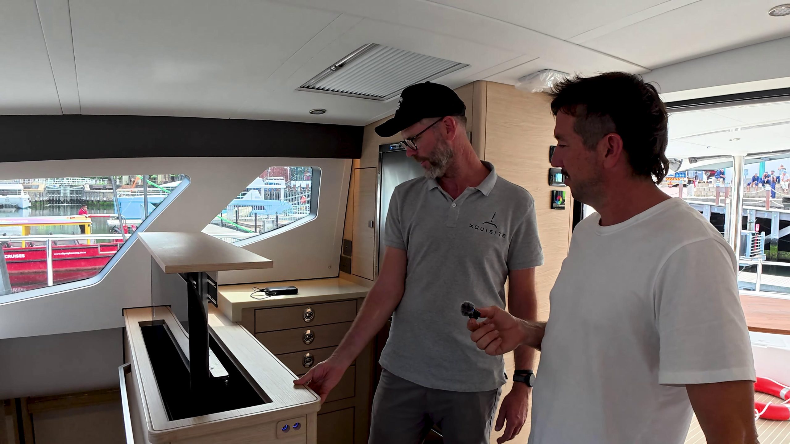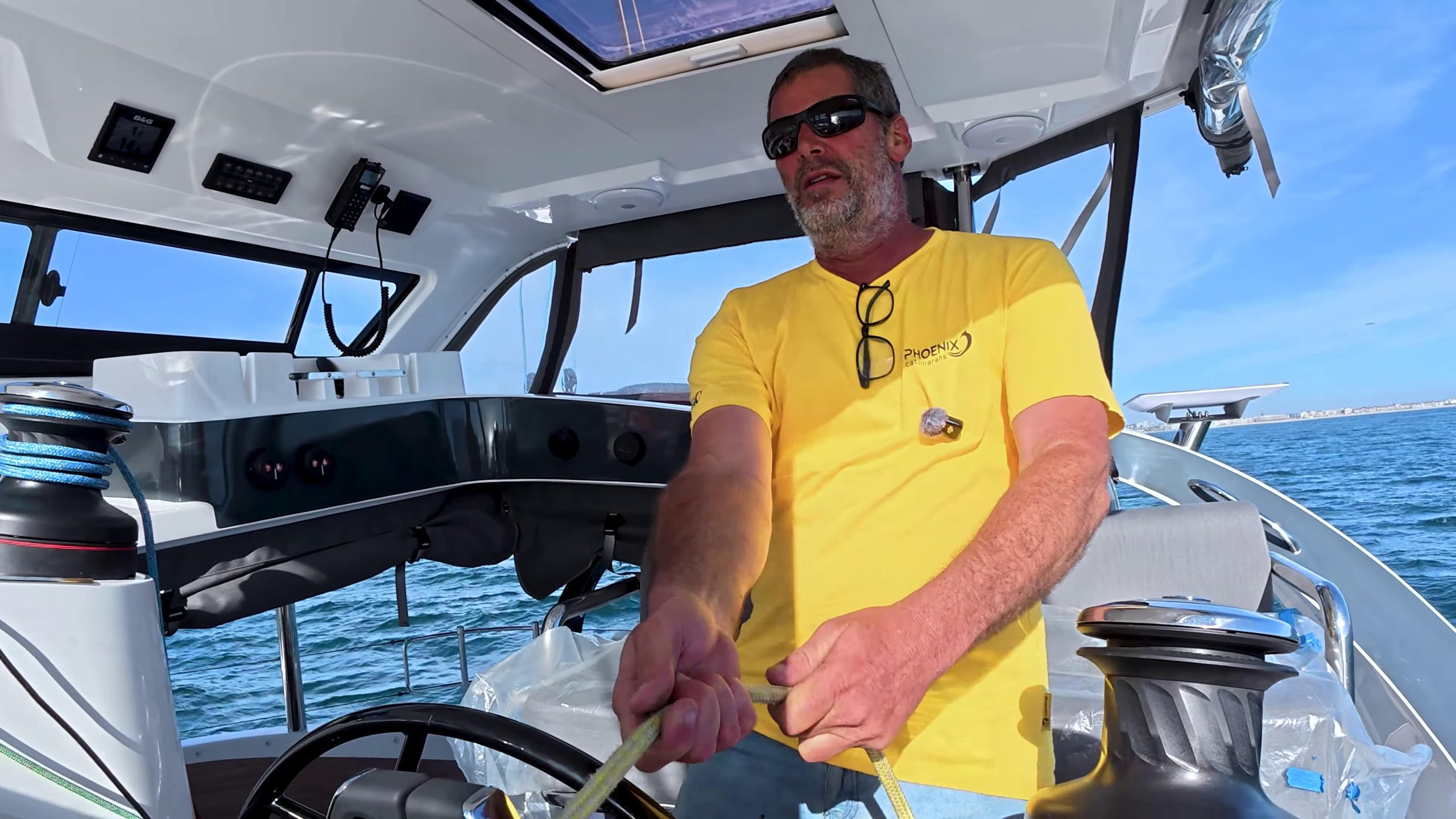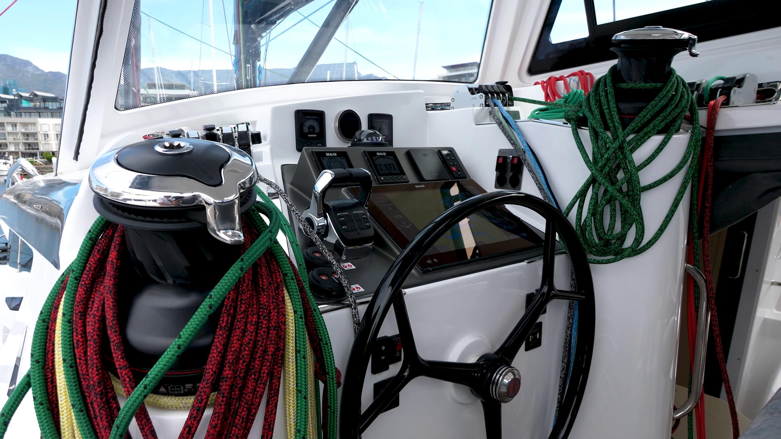 Before heading out, David from Xquisite’s South Africa QC team gave a detailed walkthrough. The helm station runs dual B&G displays with CZone touchscreen control, electric winches, and color-coded lines – everything positioned so the boat can be sailed single-handed from one spot.