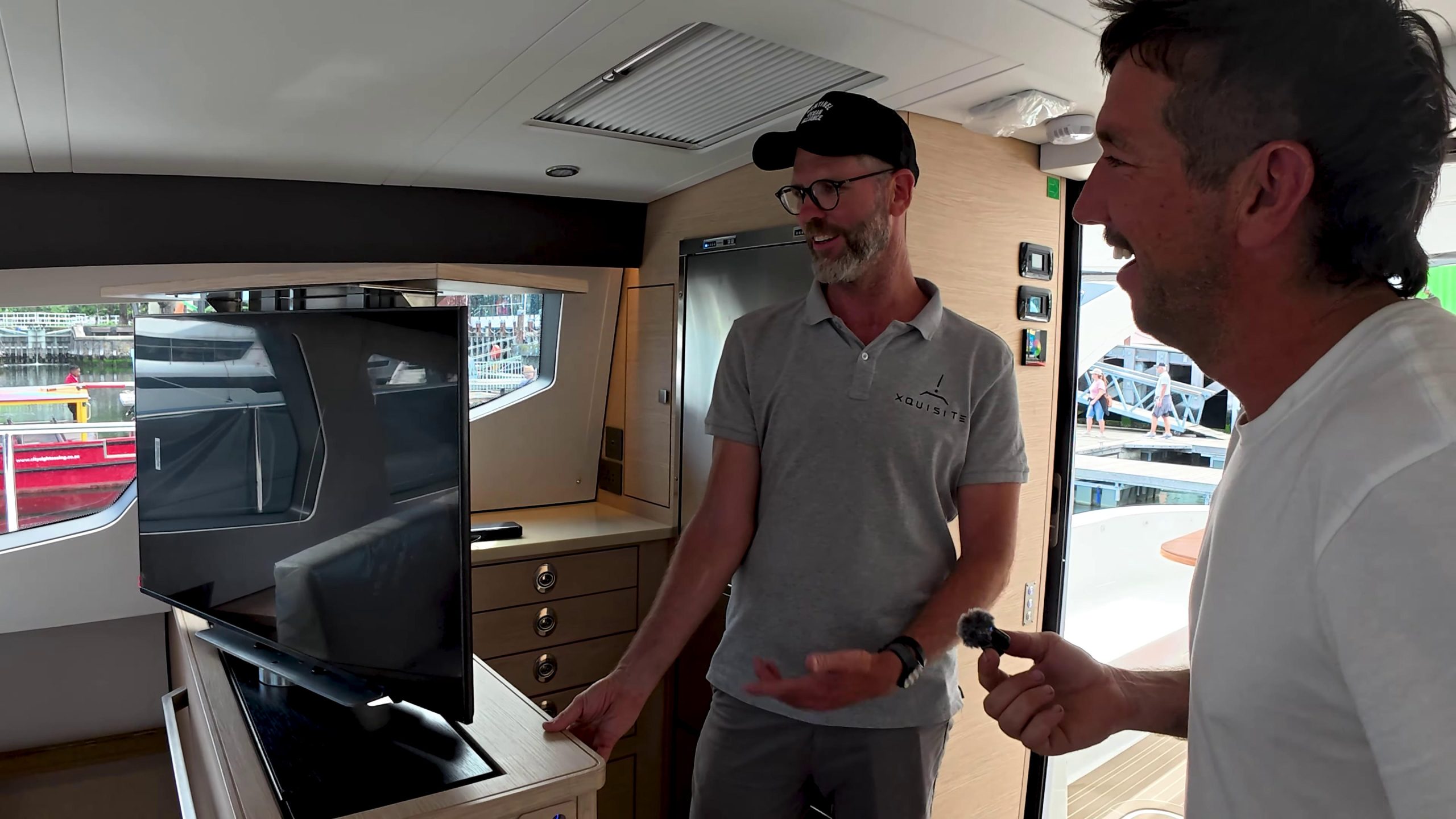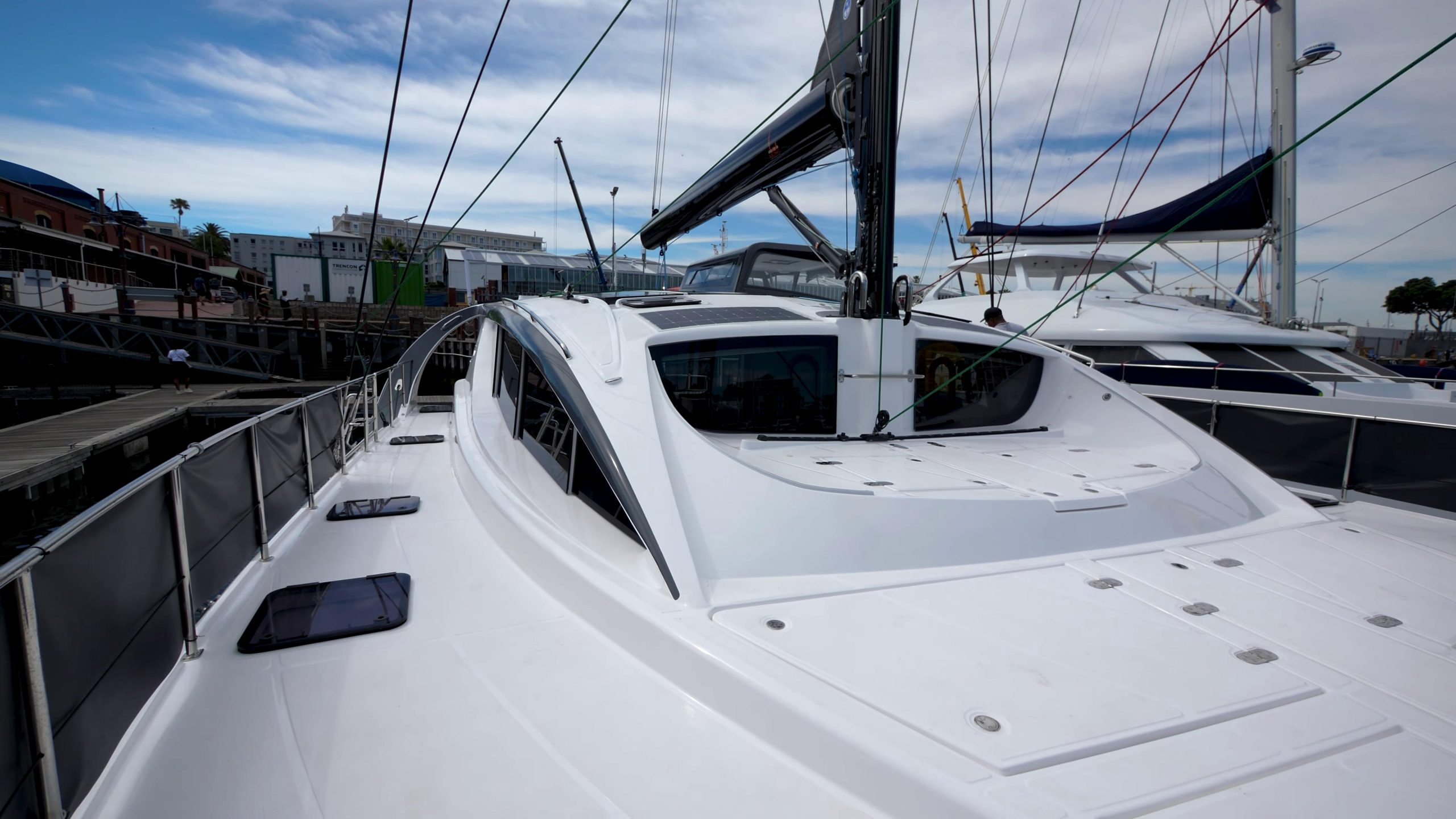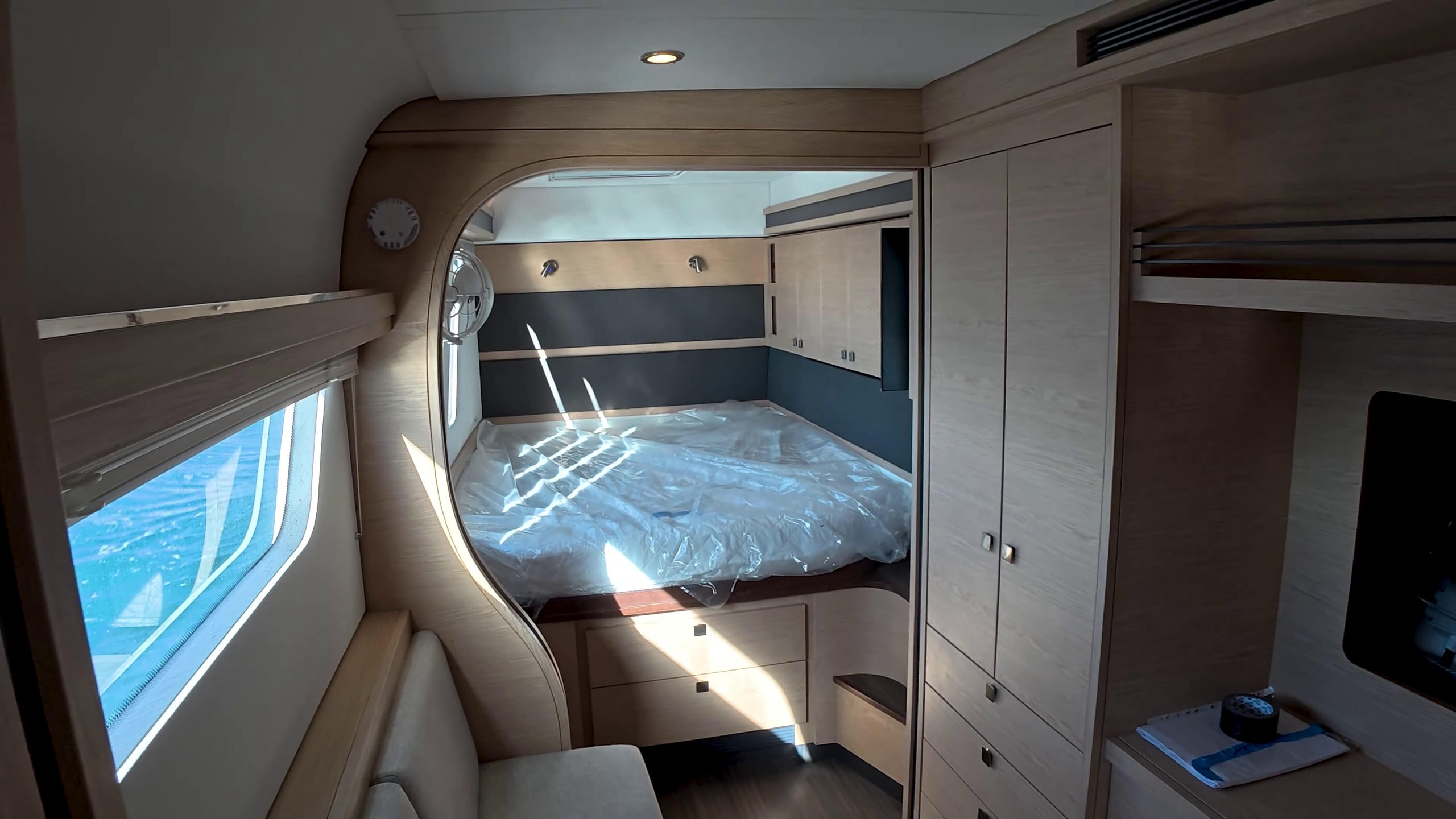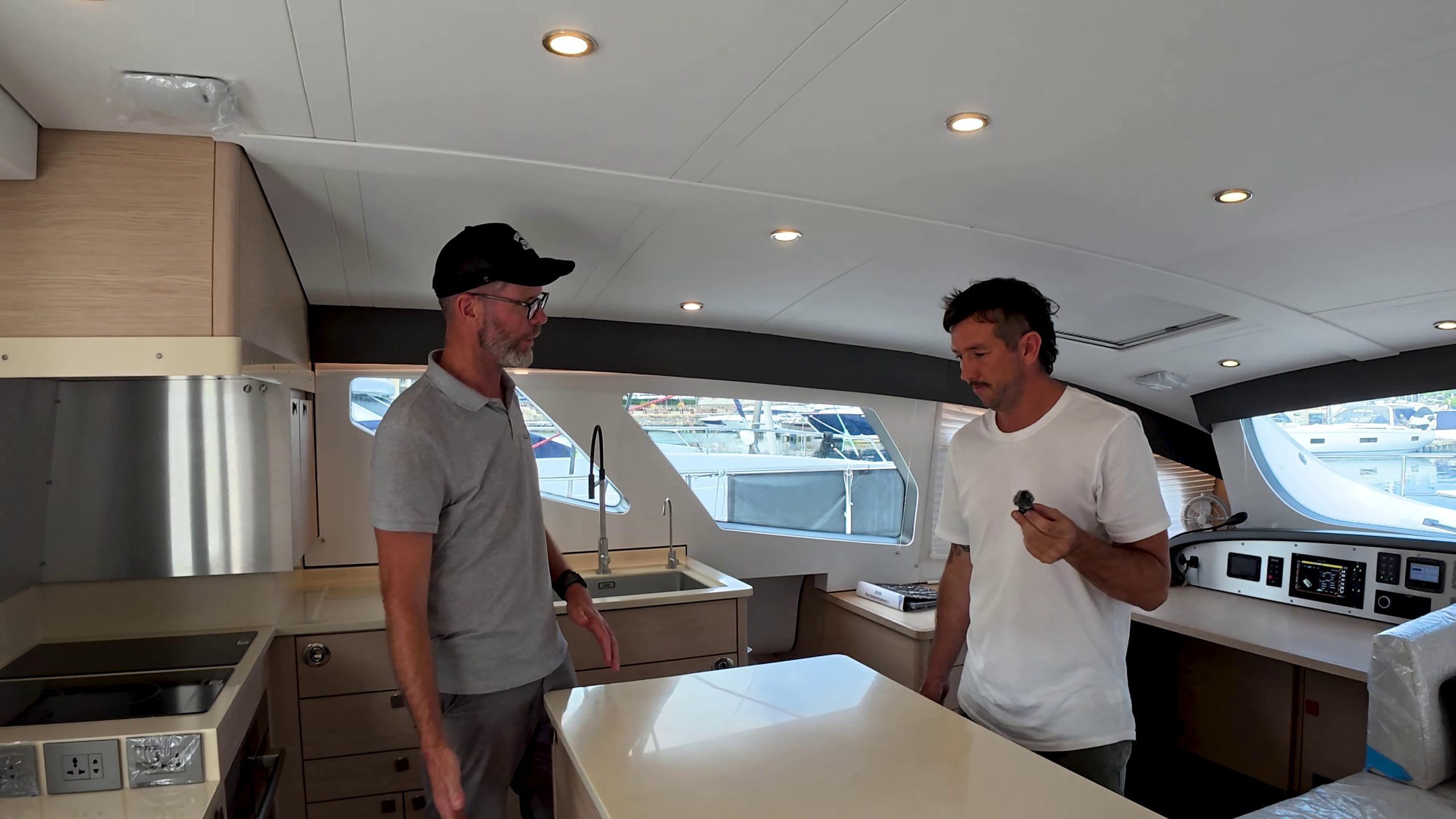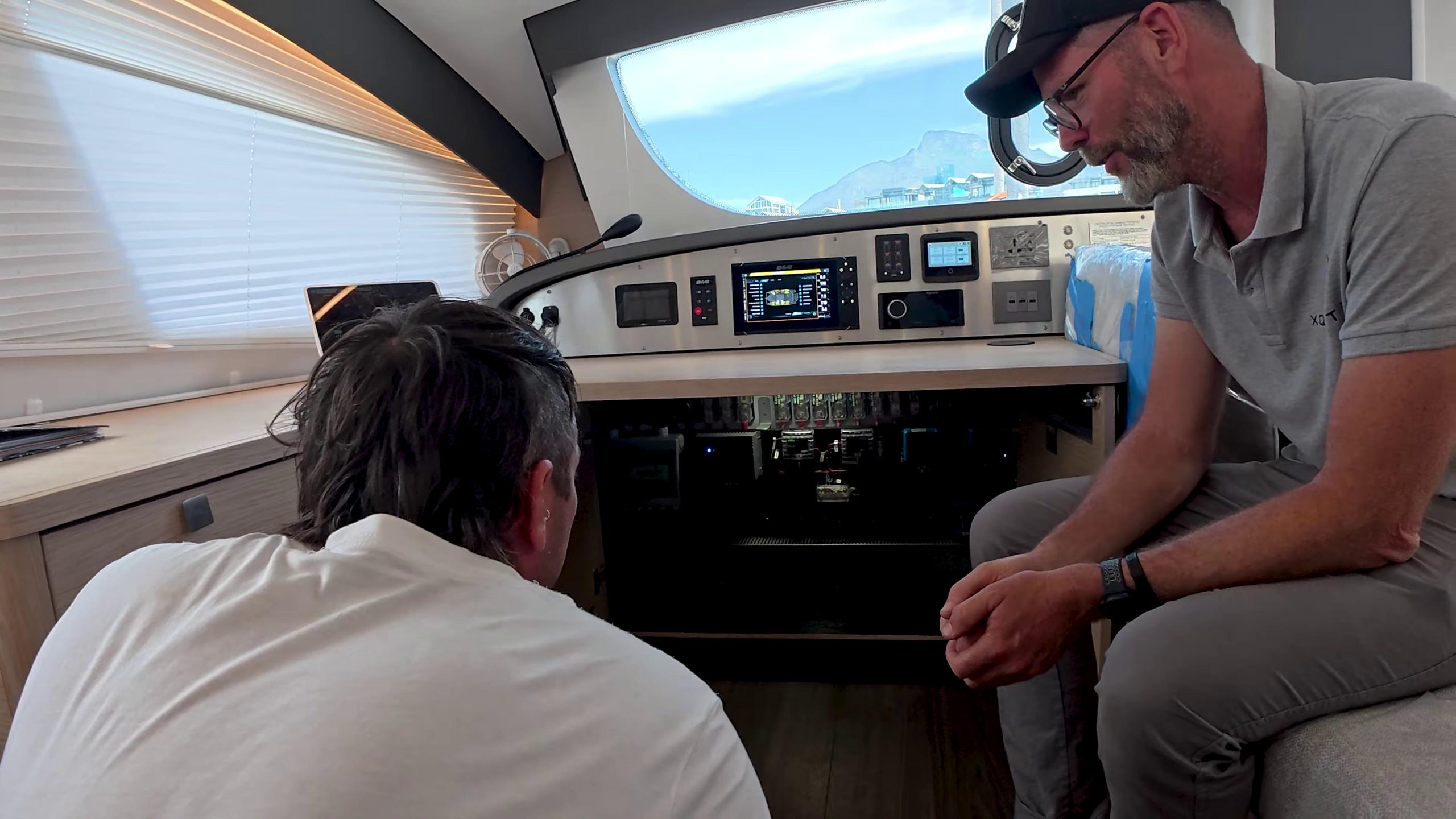 Before heading out, David from Xquisite’s South Africa QC team gave a detailed walkthrough. The helm station runs dual B&G displays with CZone touchscreen control, electric winches, and color-coded lines – everything positioned so the boat can be sailed single-handed from one spot.