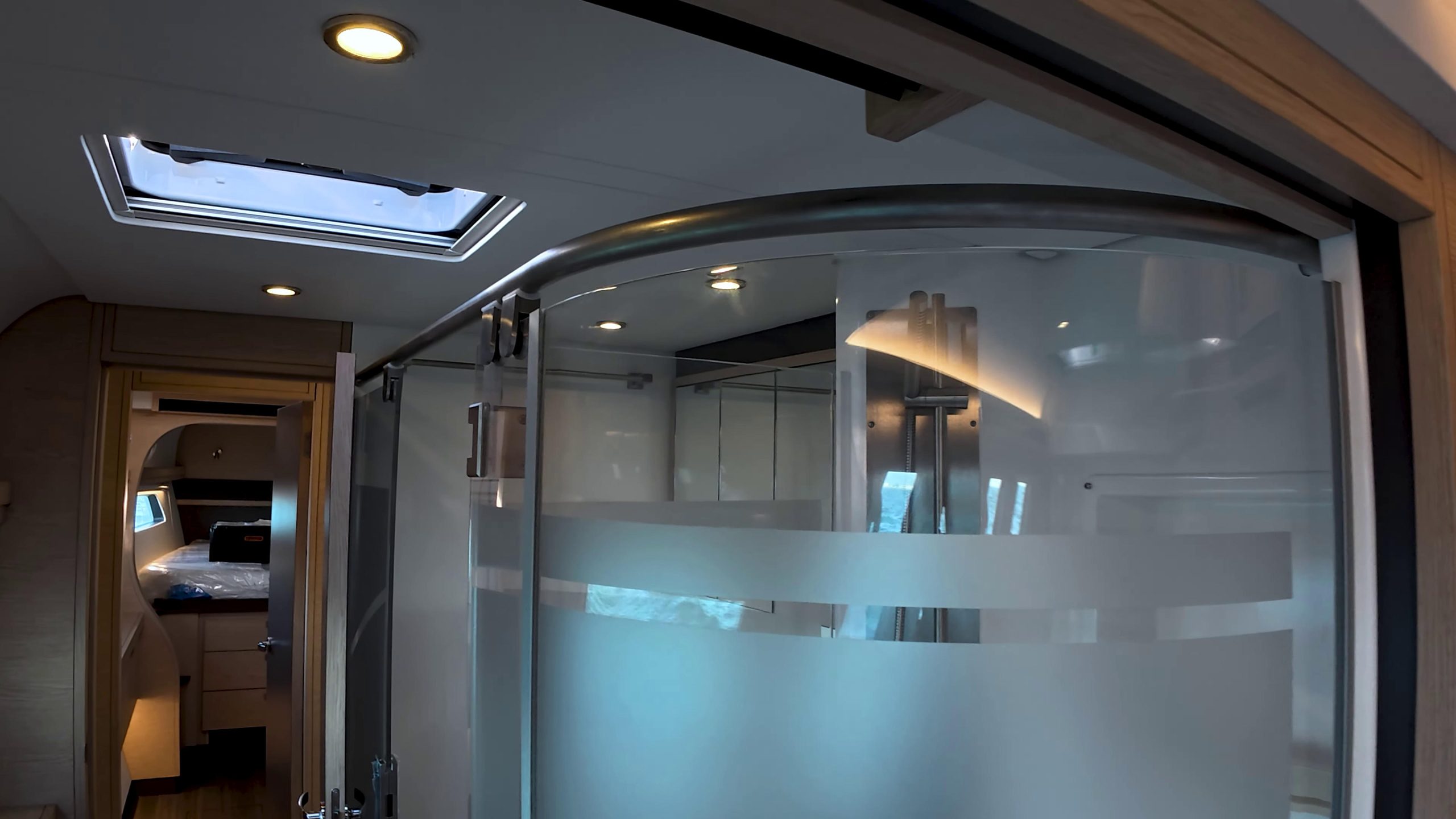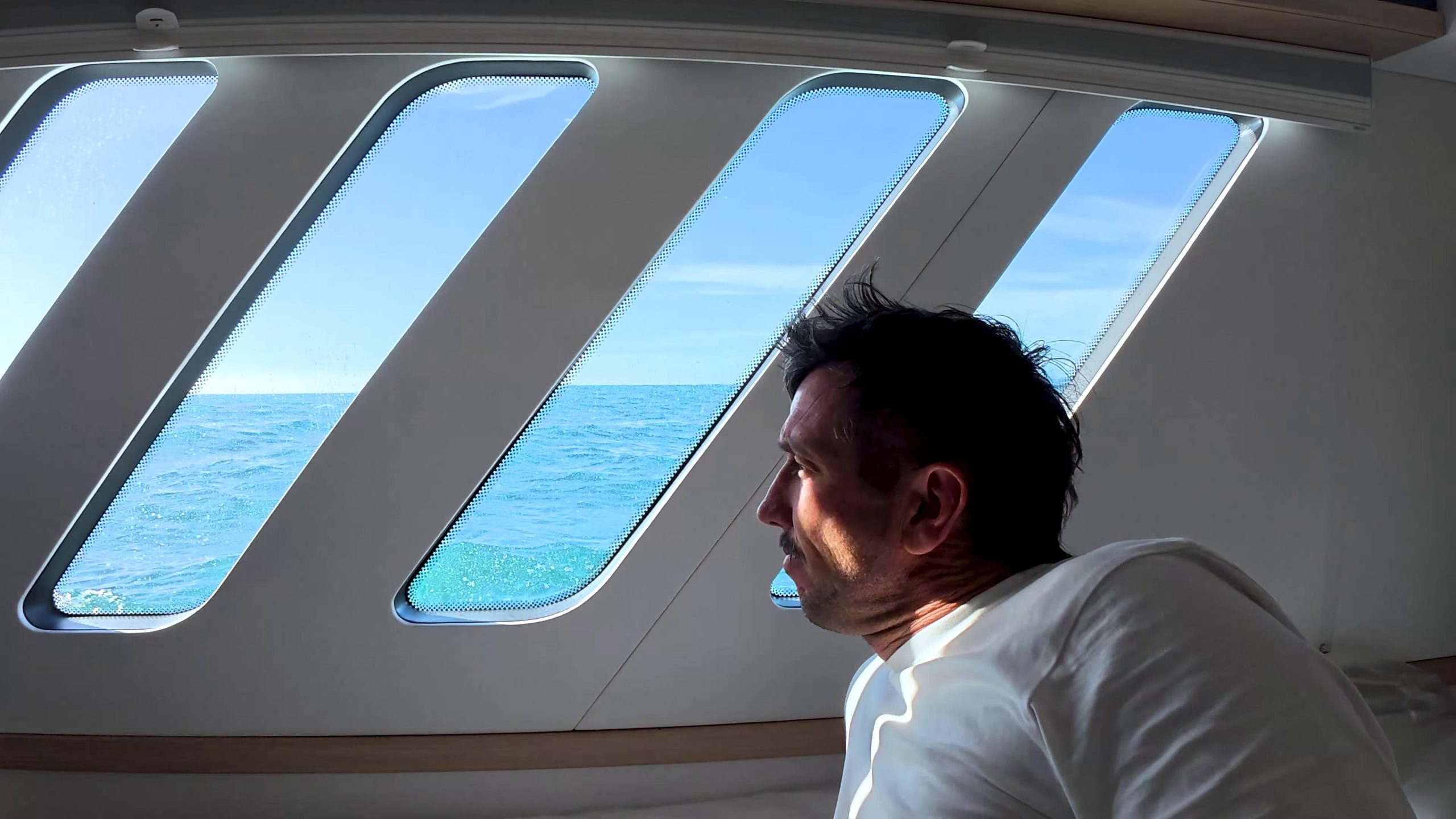 Below decks, the furniture is tabbed and glassed directly into the hull structure – foam-core panels with veneer keep weight down while eliminating movement and noise. Freshwater toilets, soundproofed engine rooms. The galley has a full island bench with dishwasher, induction hobs, and an oven/microwave combo. The owner’s suite spans the full beam with a walk-in closet and washer/dryer forward.