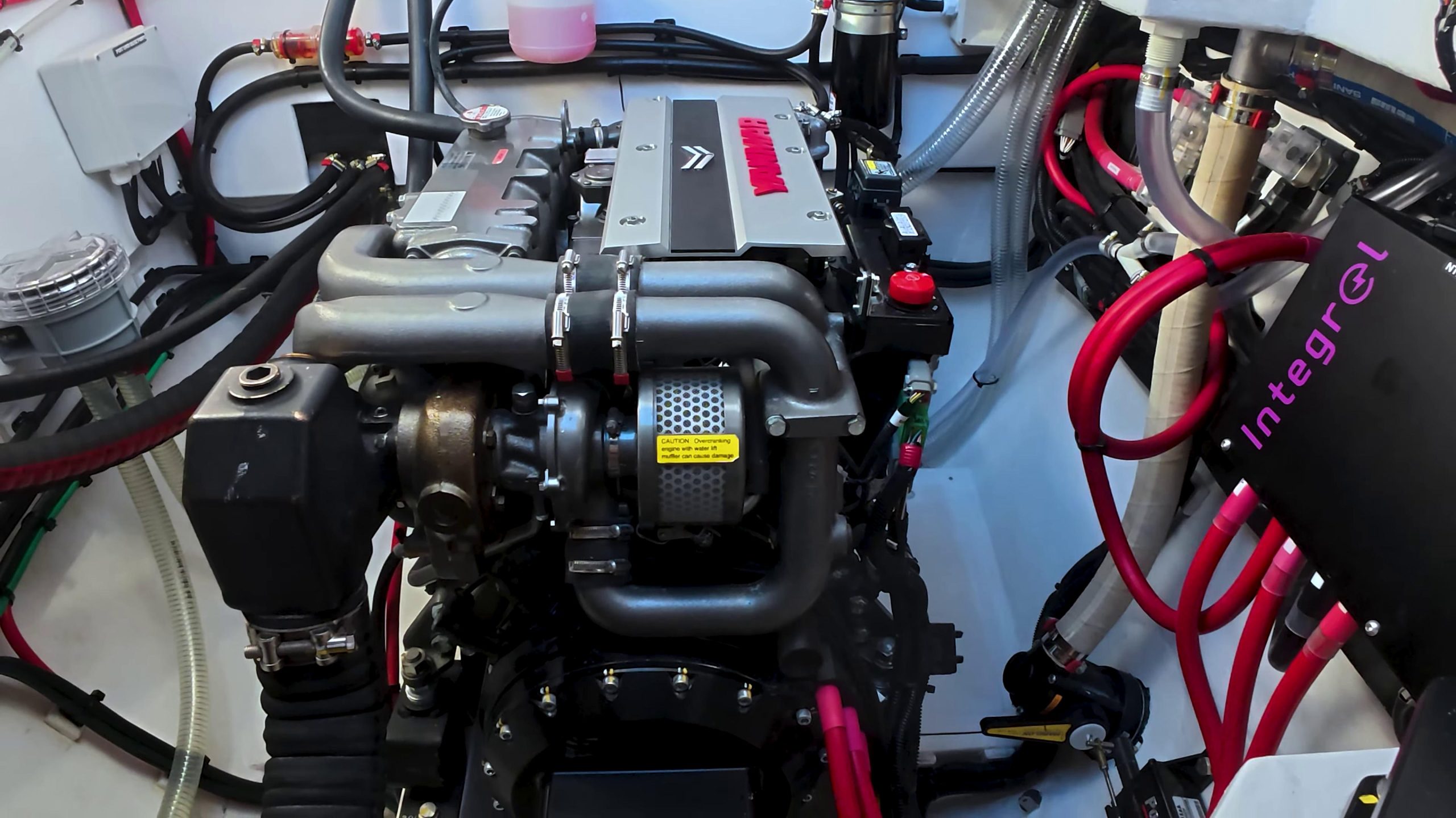 The parallel hybrid drivetrain pairs a Yanmar 4-cylinder SD60 saildrive with an Integral 15 kW electric motor per hull, drawing from a 44 kWh lithium battery bank split across 48V and 24V systems – enough stored energy to motor in and out of anchorages on electric alone. Every critical system has a manual backup, and CZone automation ties it all together so the entire boat’s power state can be managed from a single touchscreen.
