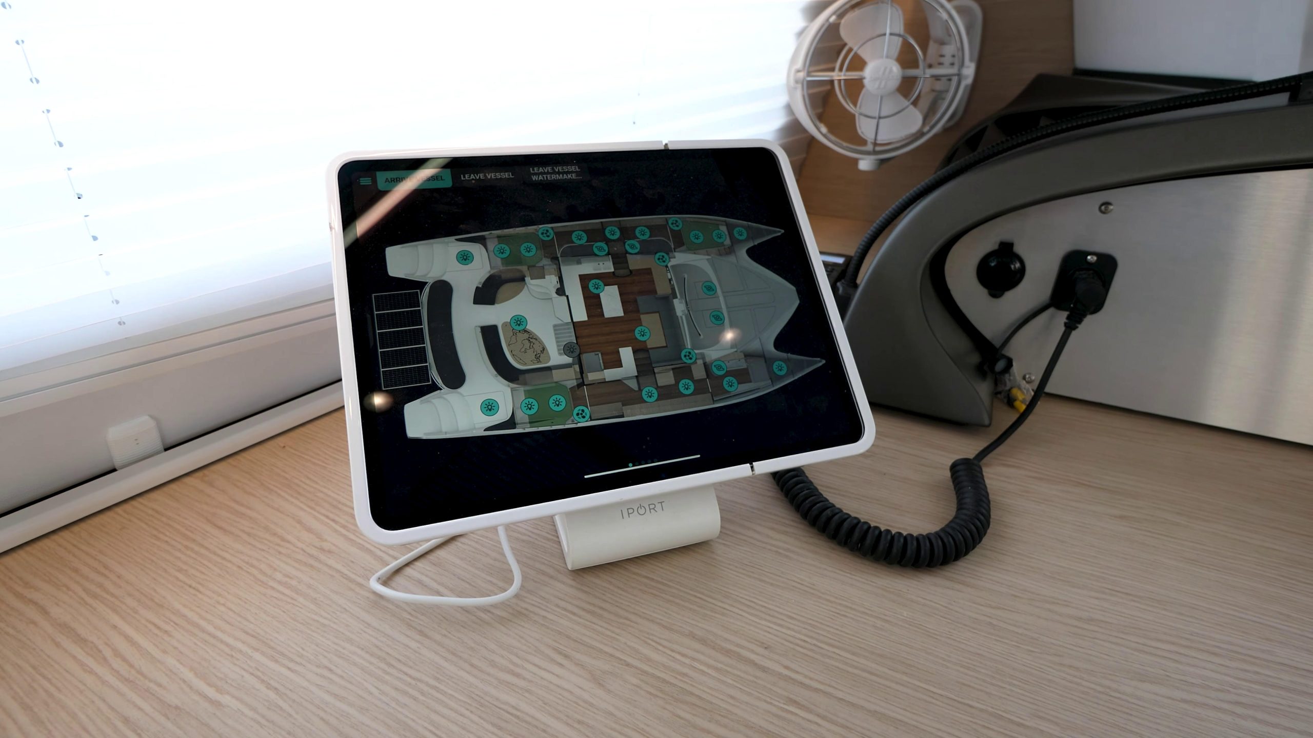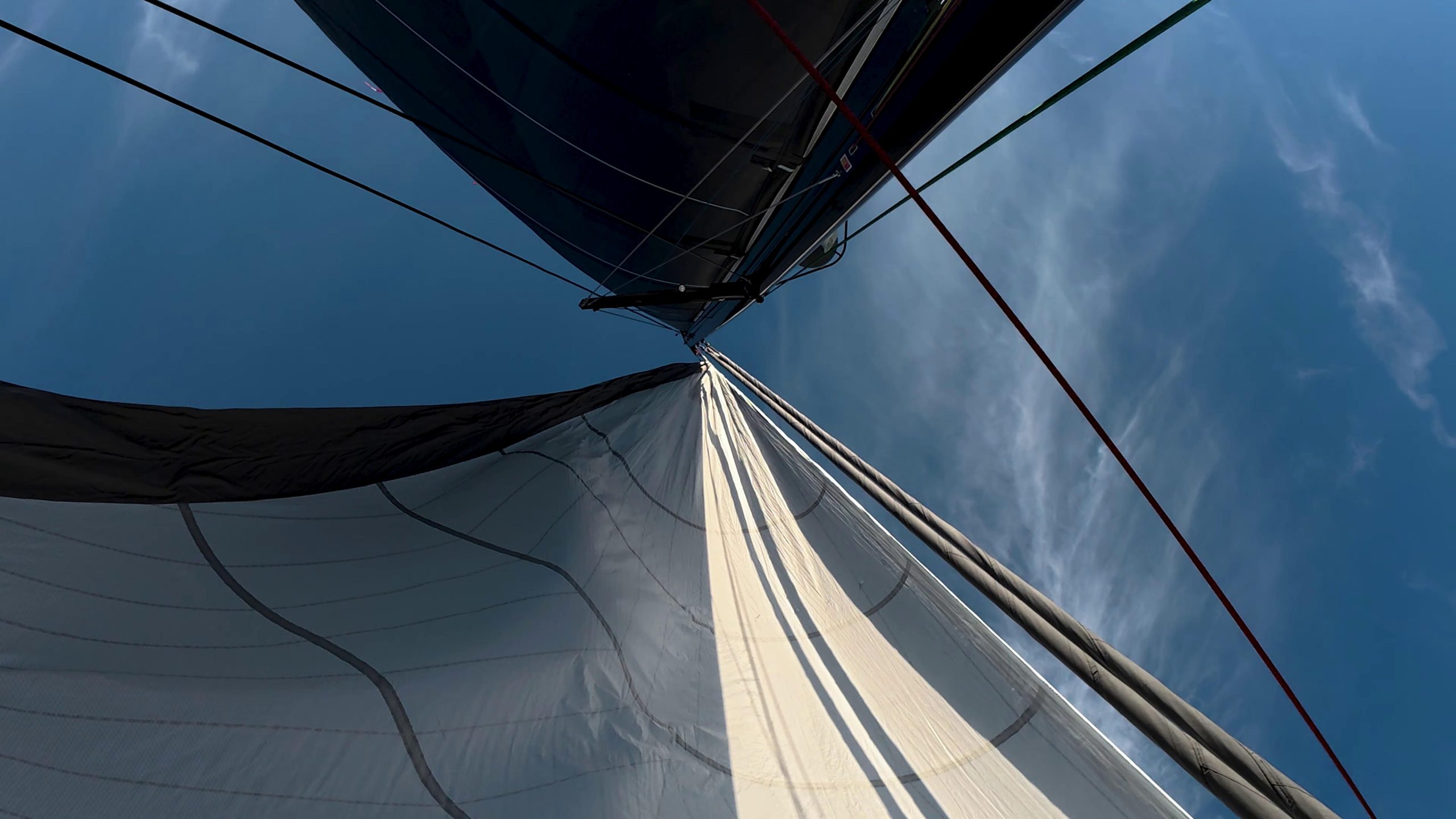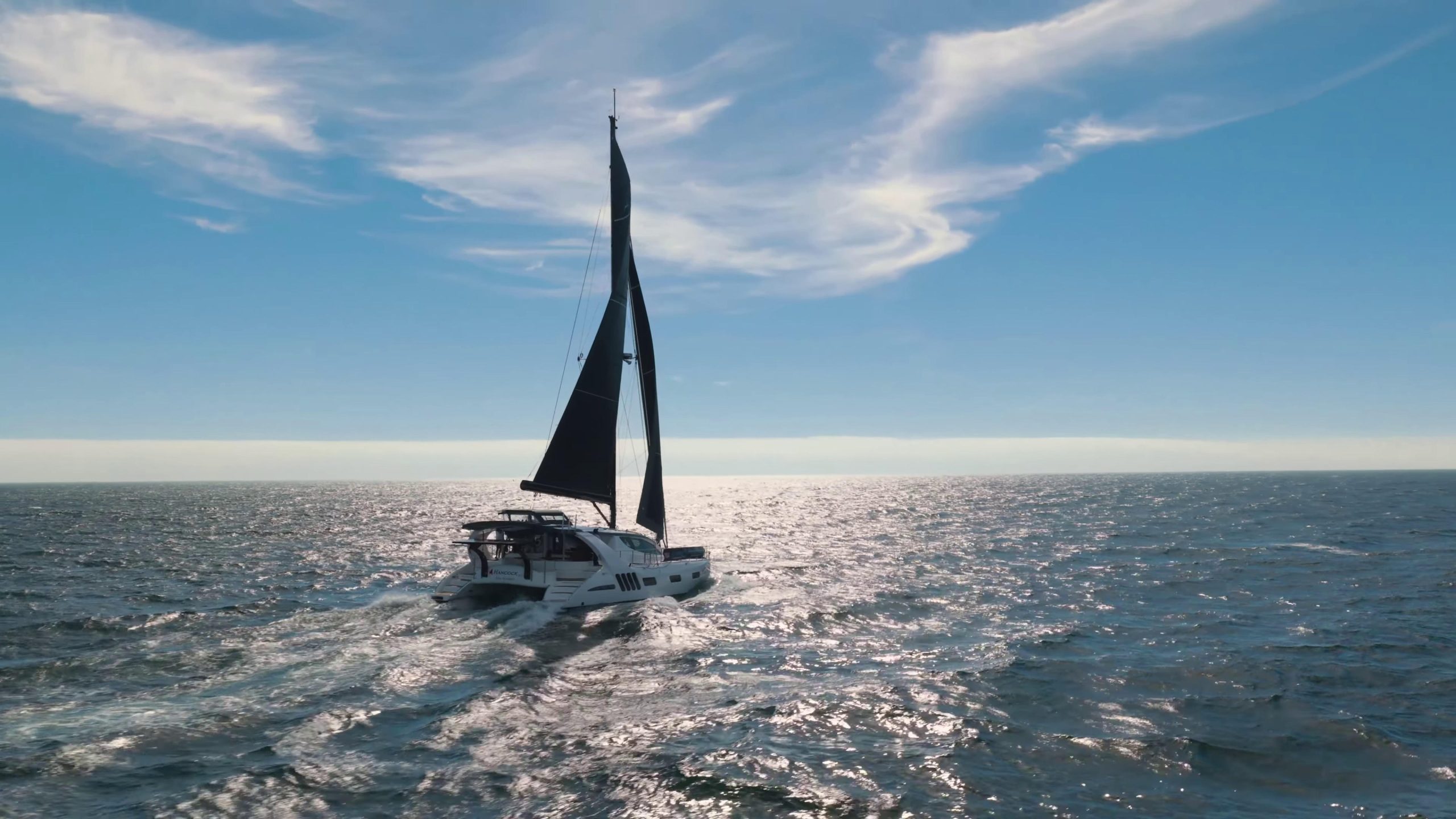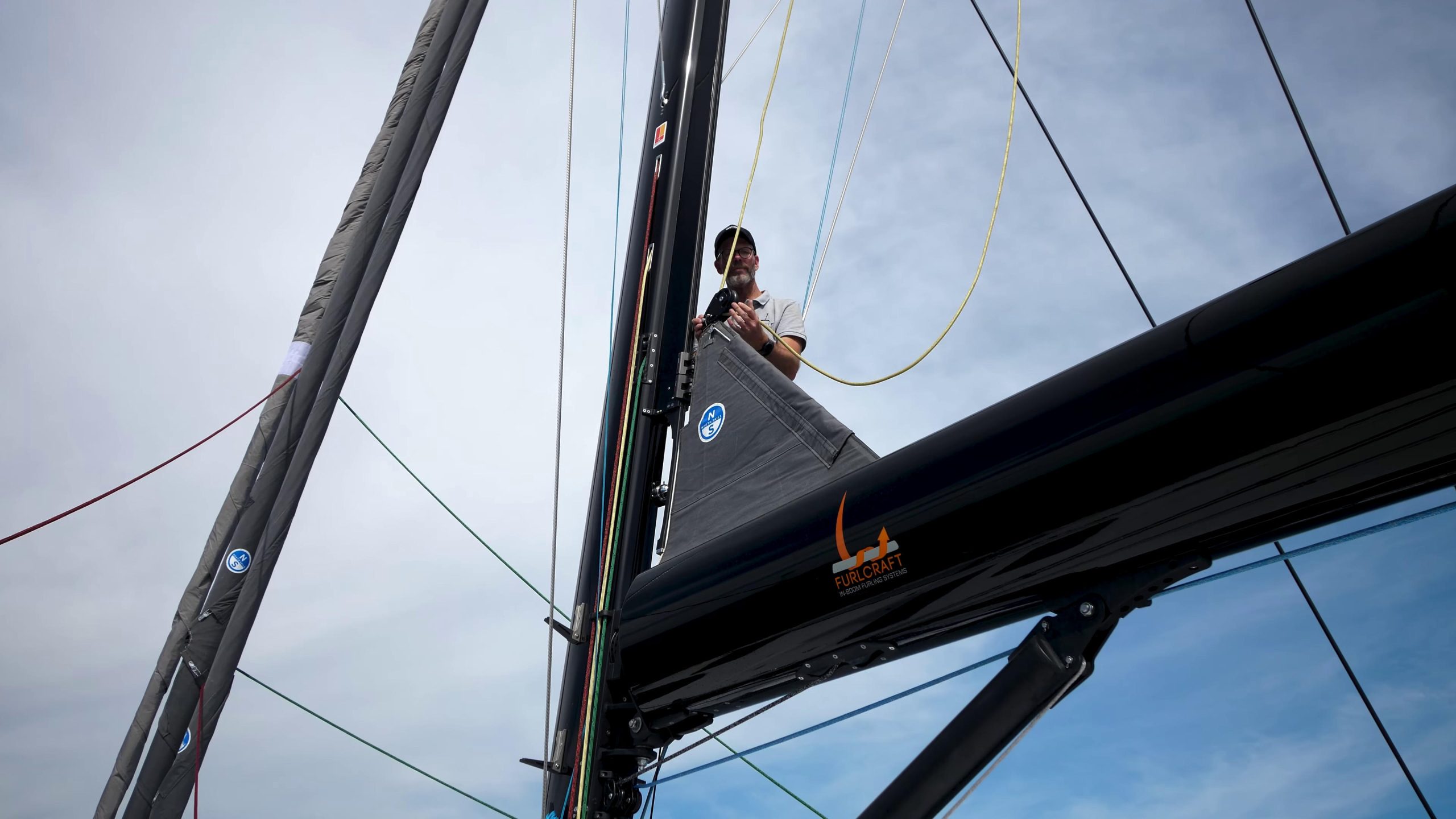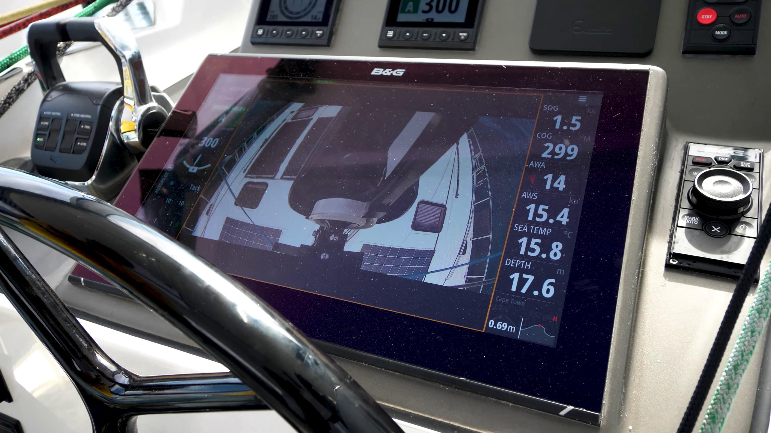 Mast and boom cameras feed the helm screens for full visibility during sail handling and docking.
