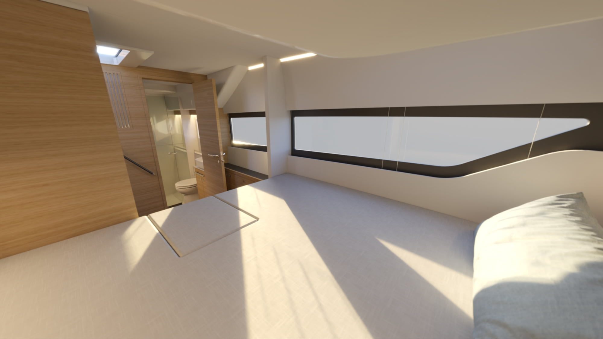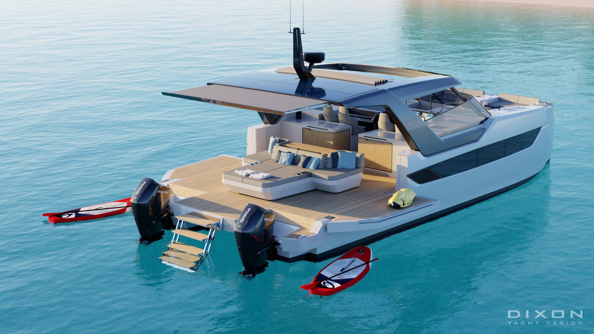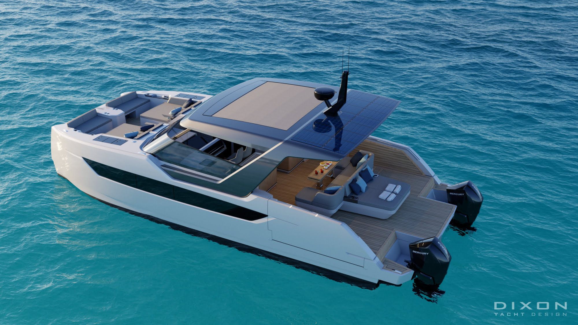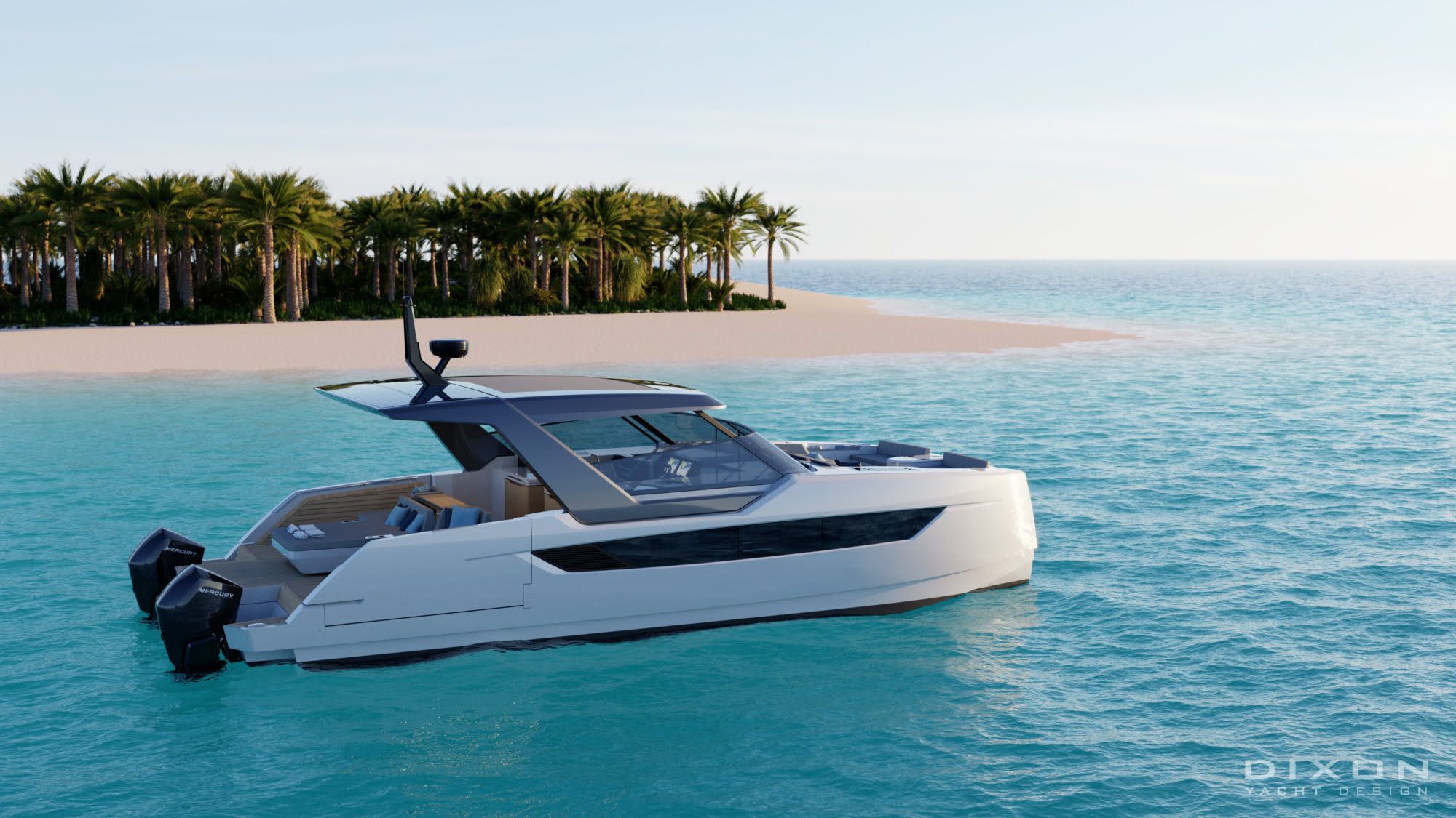 This compact soon to be launched powercat, features a sober design characterized by a semi-suspended T-Top – so that, in fine weather, it’s somewhere between an Open and a Cabin Cruiser. This perfect weekender, designed in collaboration with Dixon Yacht Design, offers excellent handling qualities, top-level performance, and genuine comfort both at anchor and underway.