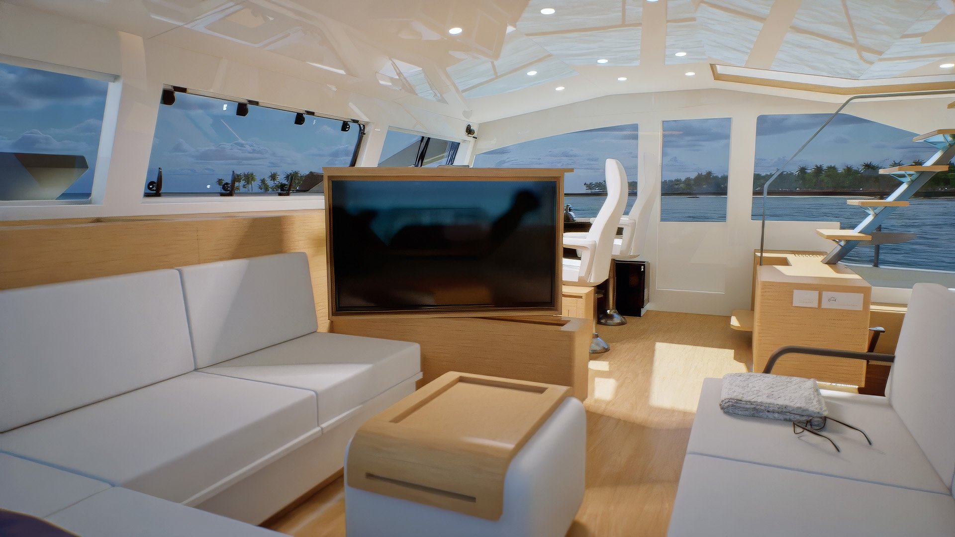 This new powercat embodies Xquisite Yachts’ signature design elements, including distinctive arch-style coachroof supports and prioritized onboard comfort, creating an unmatched luxury experience. Equipped with a hybrid diesel-electric propulsion system, she achieves energy independence via an expansive solar panel array installed on both the bimini and T-Top, significantly enhancing power efficiency.