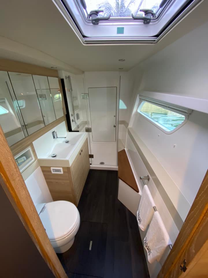 Our test boat was equipped with the three-cabin layout, with the entire starboard hull dedicated to an owner’s suite and the port hull divided between another pair of staterooms. All these spaces are bright and inviting, with comfortable berths, plenty of stowage and ensuite heads with showers.