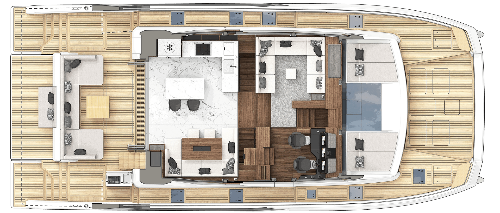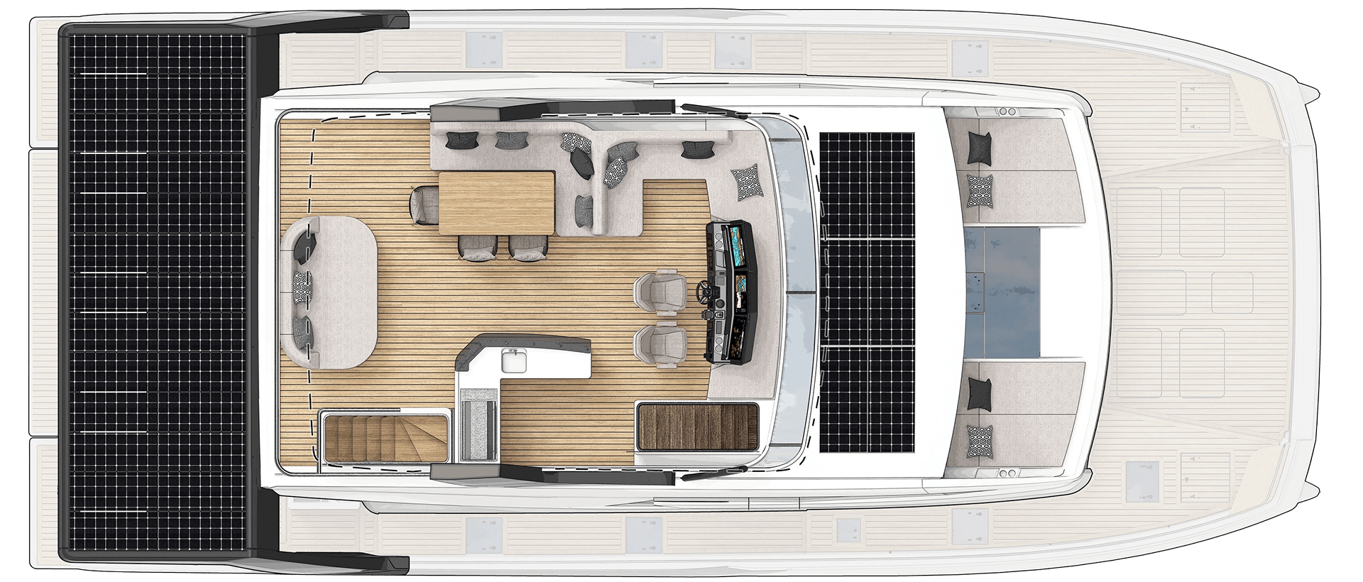 This latest flagship power Cat in our multi-award-winning line, a reflection of our dedication to futureproof sustainable luxury, offers a silent, emission-free cruising with its innovative hybrid system, allowing for extended time at sea and significant fuel savings.
